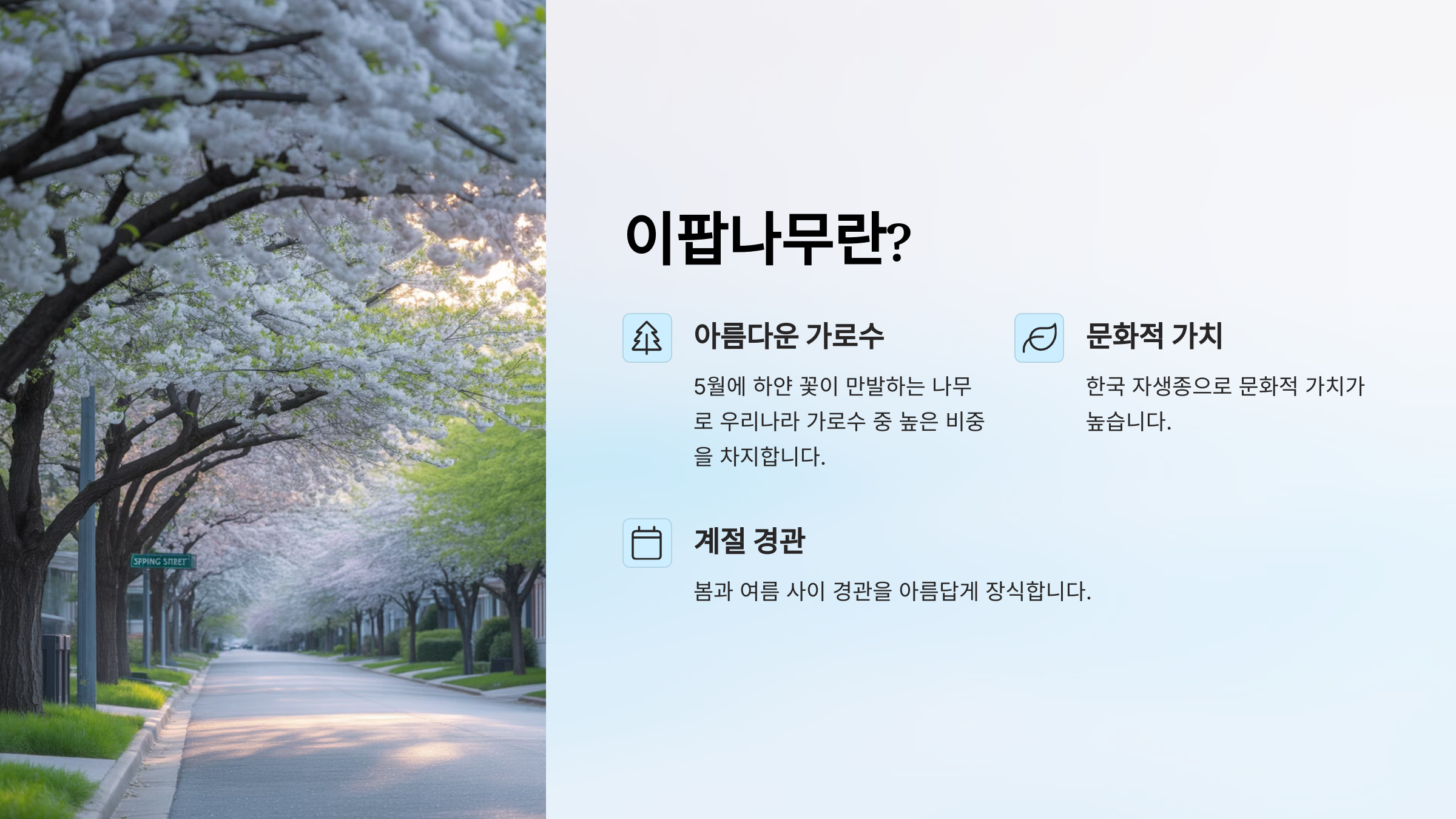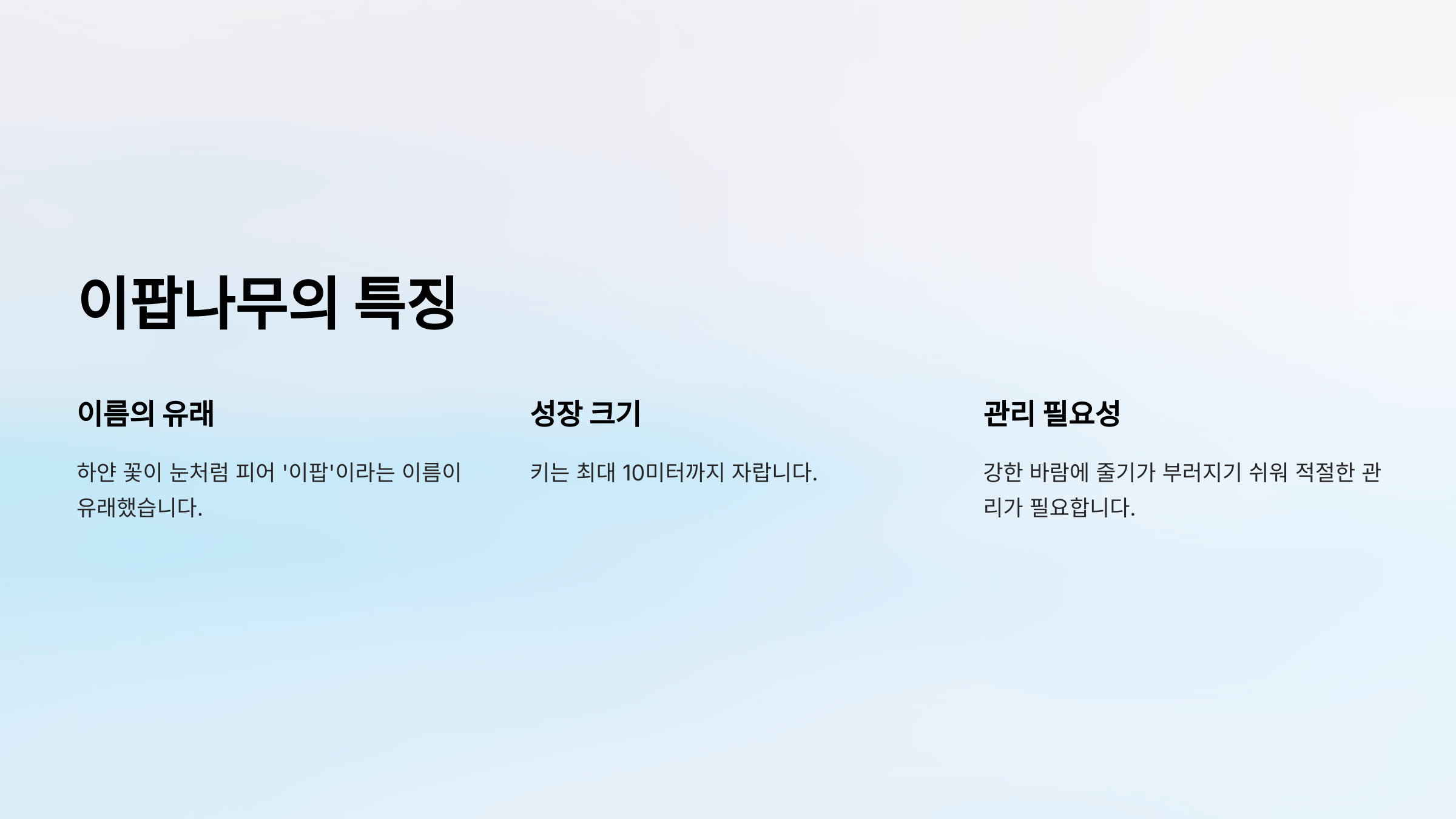 | 이팝나무 특징 | 그늘·물가 인접 지역에서도 잘 자람 |