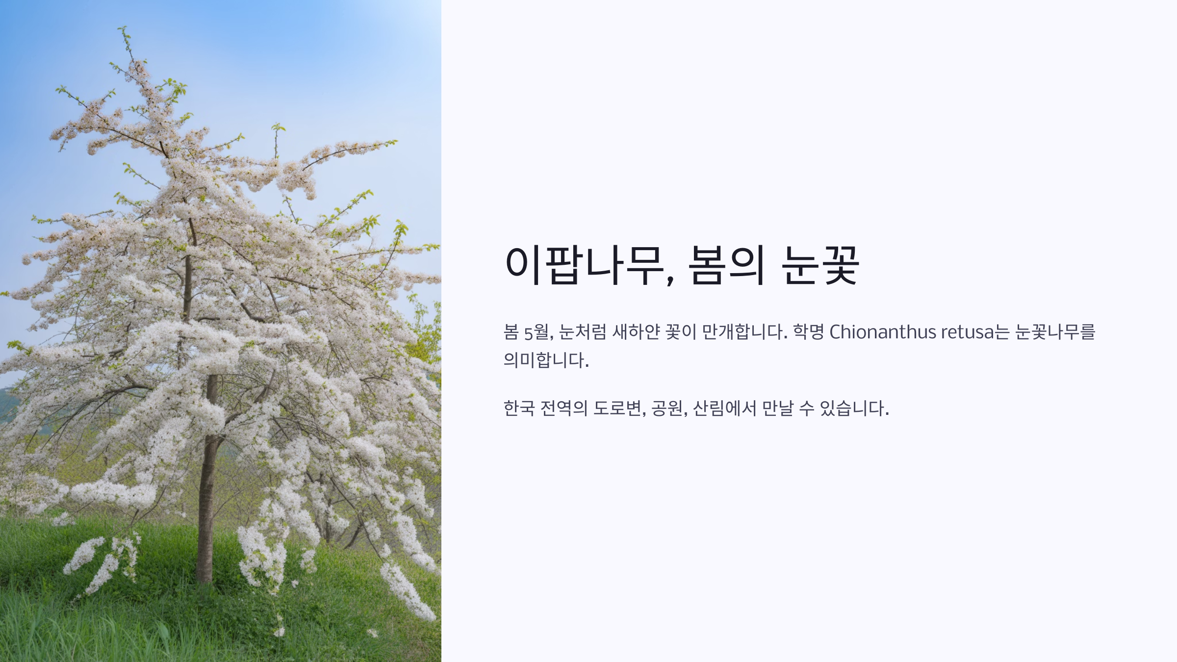 이팝나무는 늦봄, 특히 5월 초중순쯤이면 순백의 작은 꽃이 나무 전체를 뒤덮듯 피어나는 아름다운 나무예요. 꽃이 피었을 때 모습이 흰 쌀밥을 닮아 '이팝(쌀밥)'나무라는 이름이 붙여졌어요. 정원수나 가로수로도 인기 많죠.