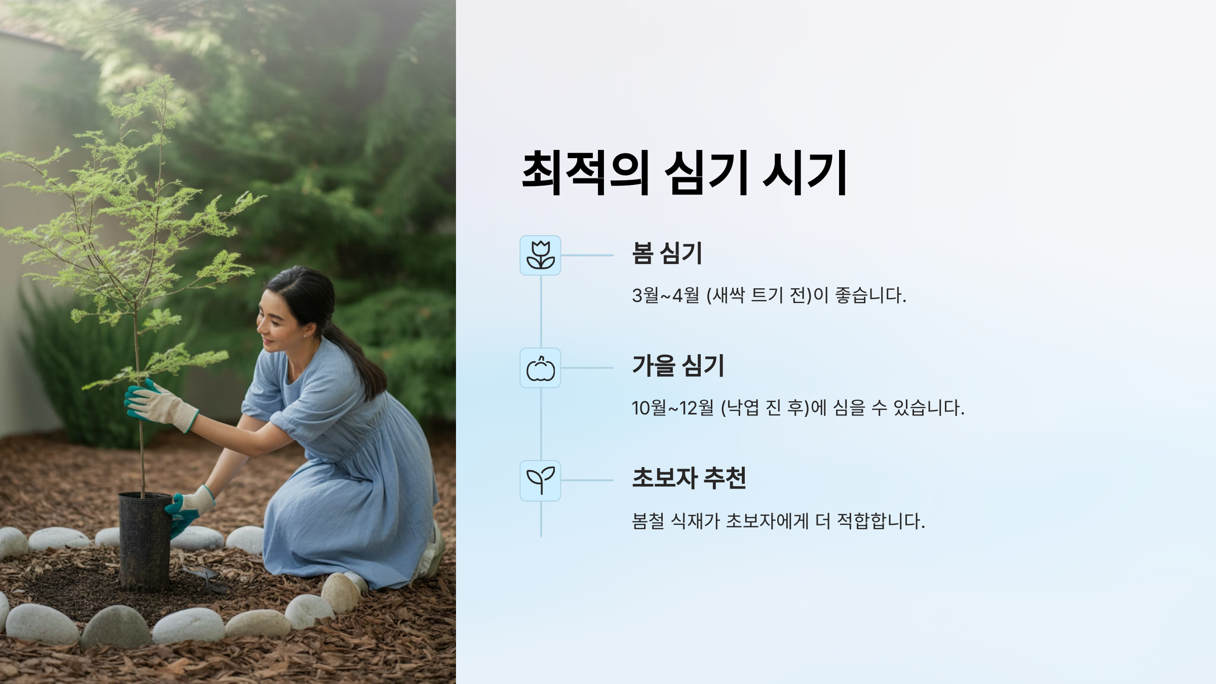 A1. 봄철 3~4월 또는 가을철 10월쯤이 좋아요. 뿌리 활착이 잘 되기 때문이에요.