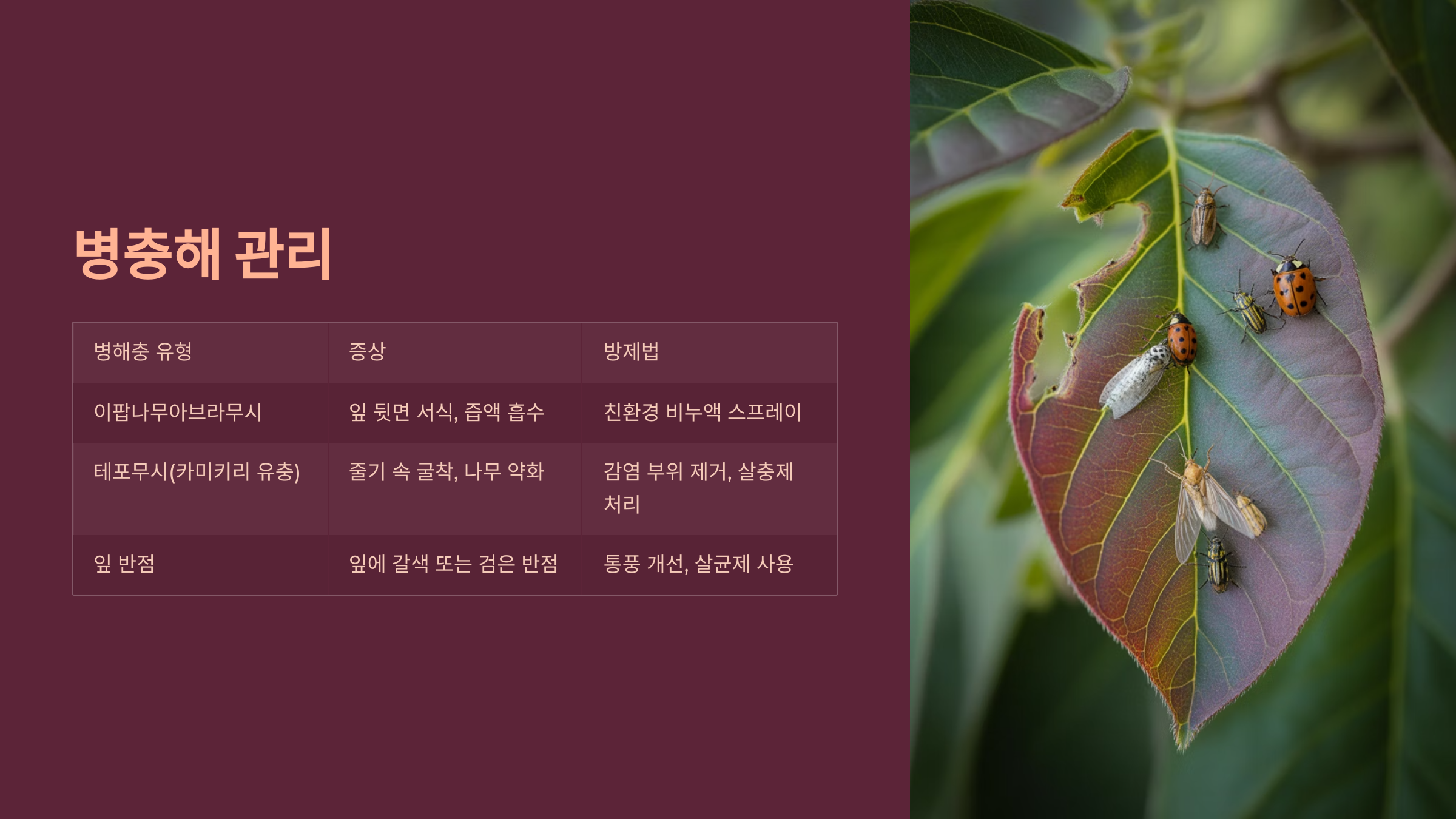 A4. 비교적 강하지만, 과습하거나 통풍이 안 되면 진딧물이나 응애가 생길 수 있어요. 주기적으로 점검해주는 게 좋아요.