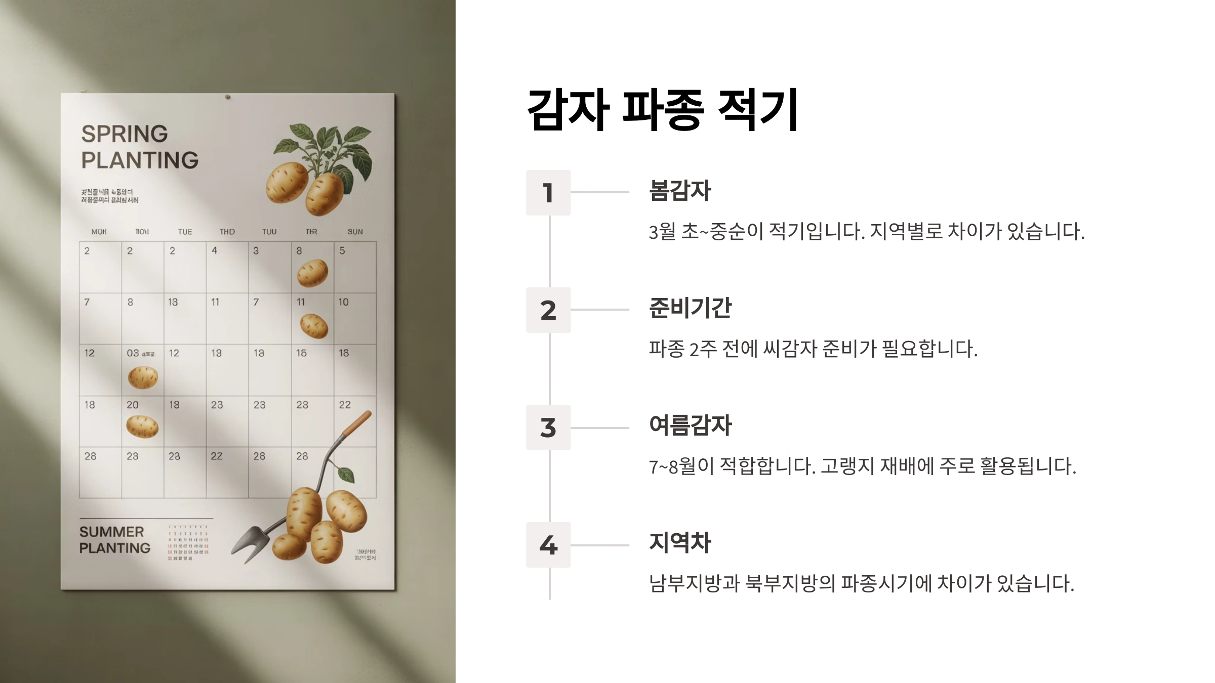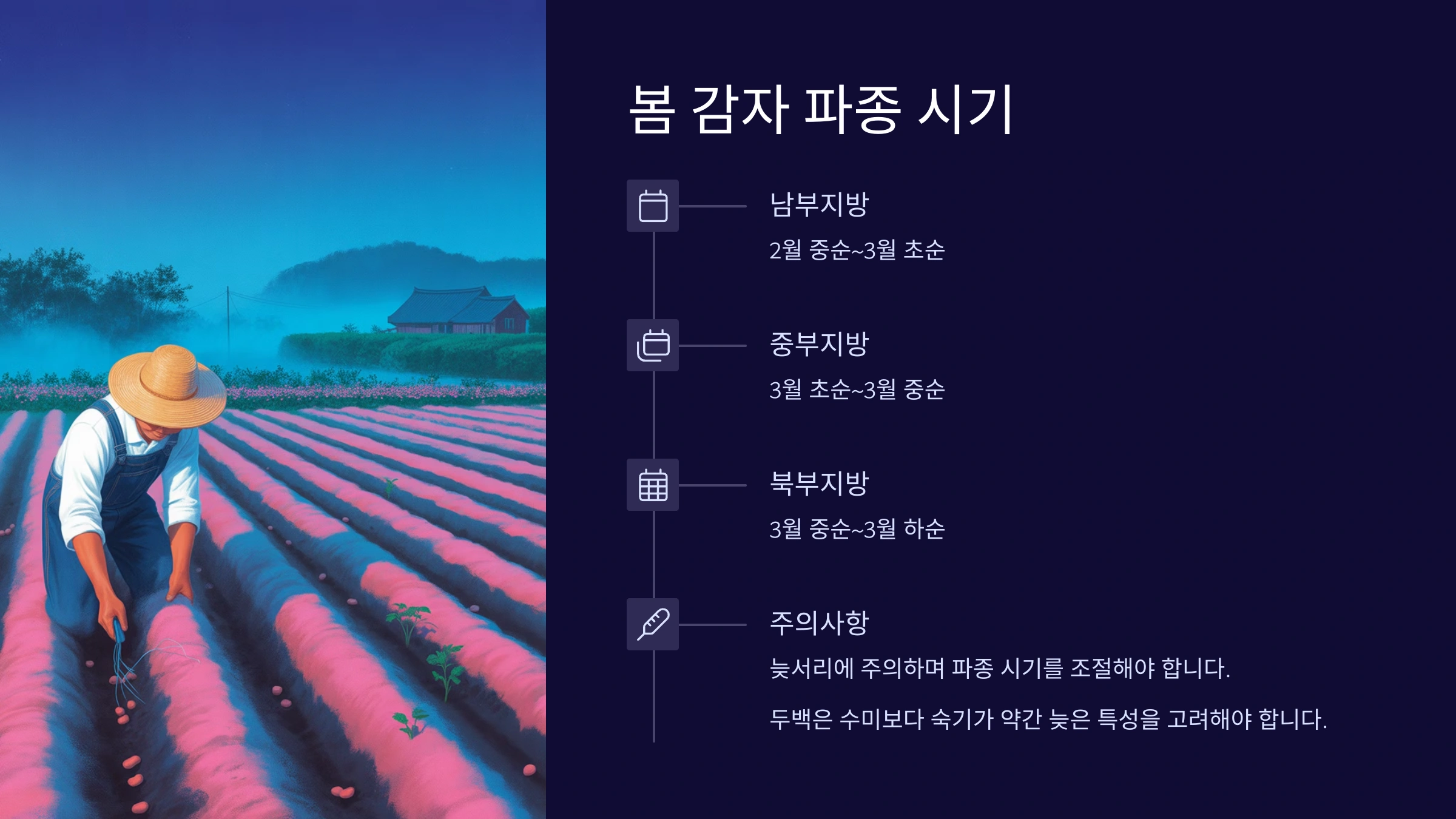 모든 농사의 시작은 '시기'를 잘 맞추는 것이죠. 감자 역시 마찬가지입니다. 너무 일찍 심으면 늦서리 피해를 볼 수 있고, 너무 늦게 심으면 고온으로 인해 감자가 제대로 크지 못해요.