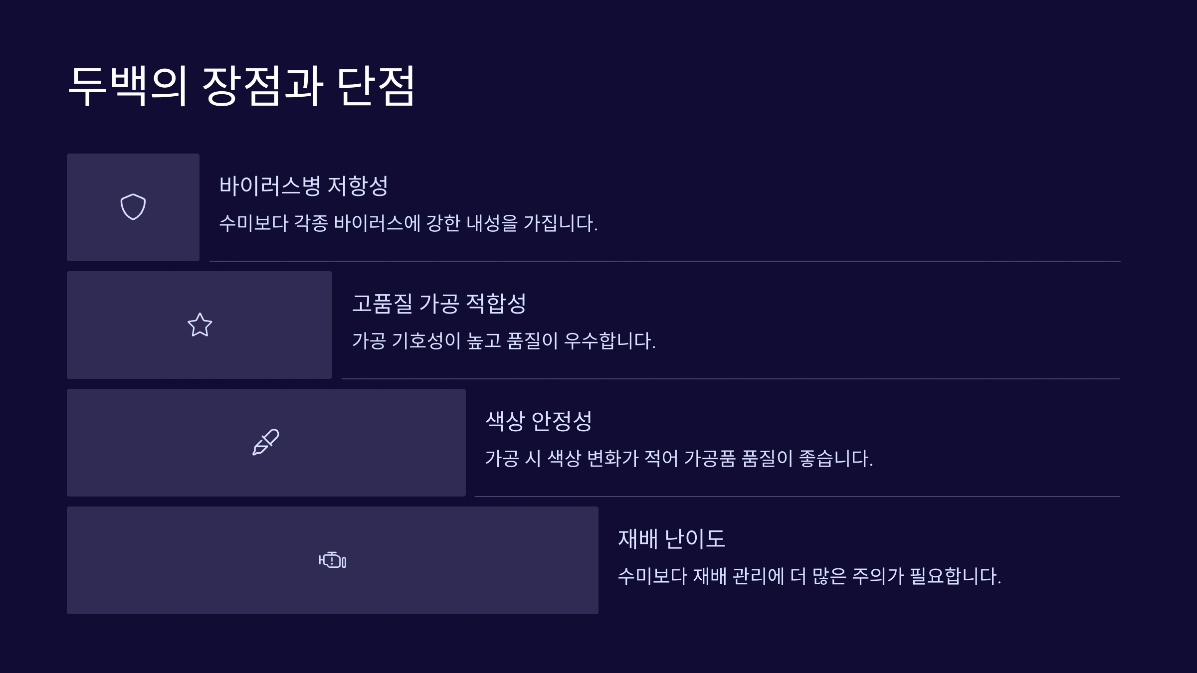 | 재배 및 수확 | 가장 대중적이며 병충해에 강한 편. 재배 기간 약 90~100일. | '쪄 먹으면 백옥같이 하얗고 맛있다'는 의미. 재배 기간 약 100~110일. |