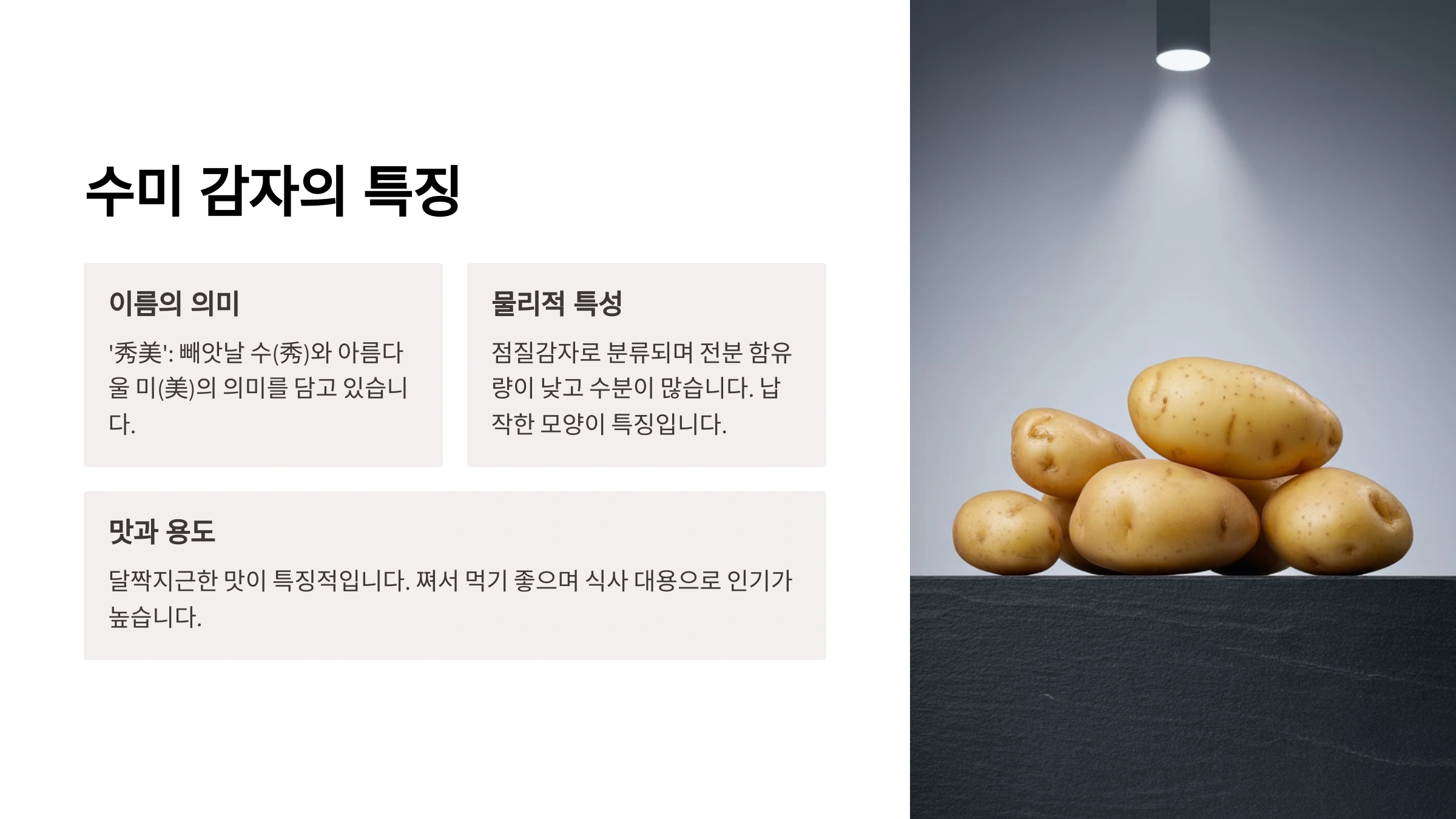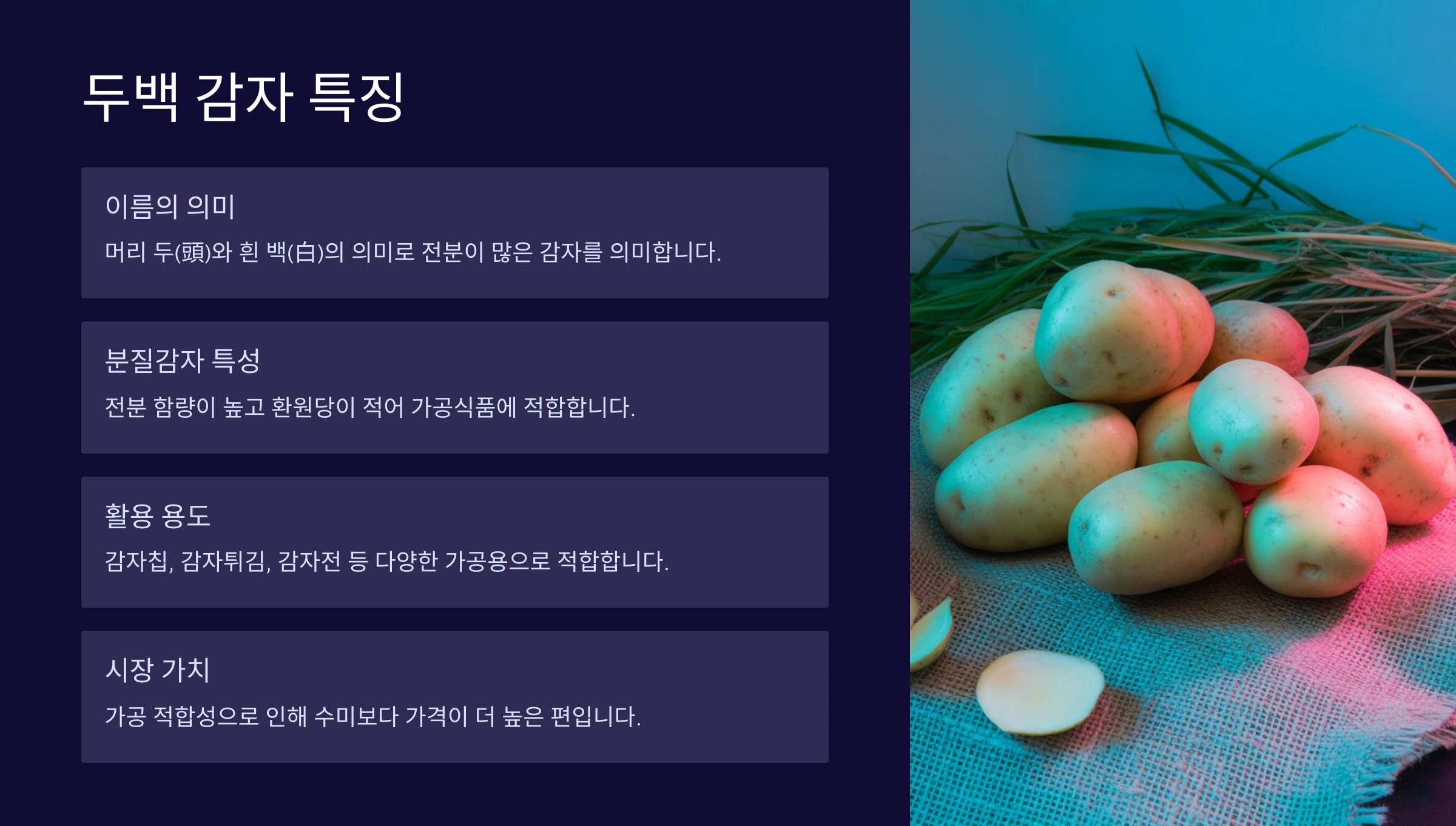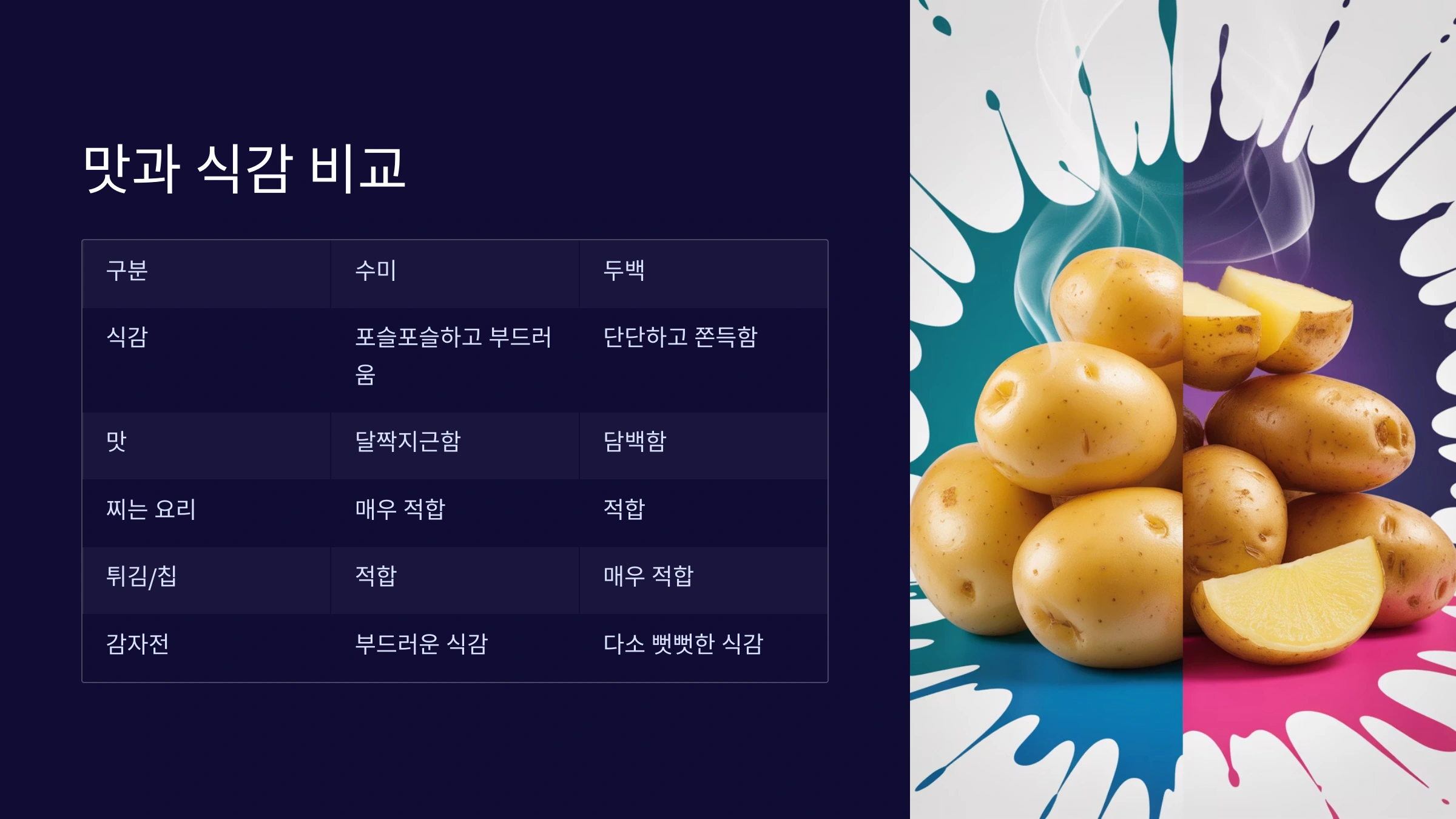우리나라에서 가장 사랑받는 감자 품종, 바로 '수미'와 '두백'이죠. 두 품종은 맛과 식감, 그리고 어울리는 요리가 전혀 달라 취향에 맞게 선택하는 것이 중요합니다.
