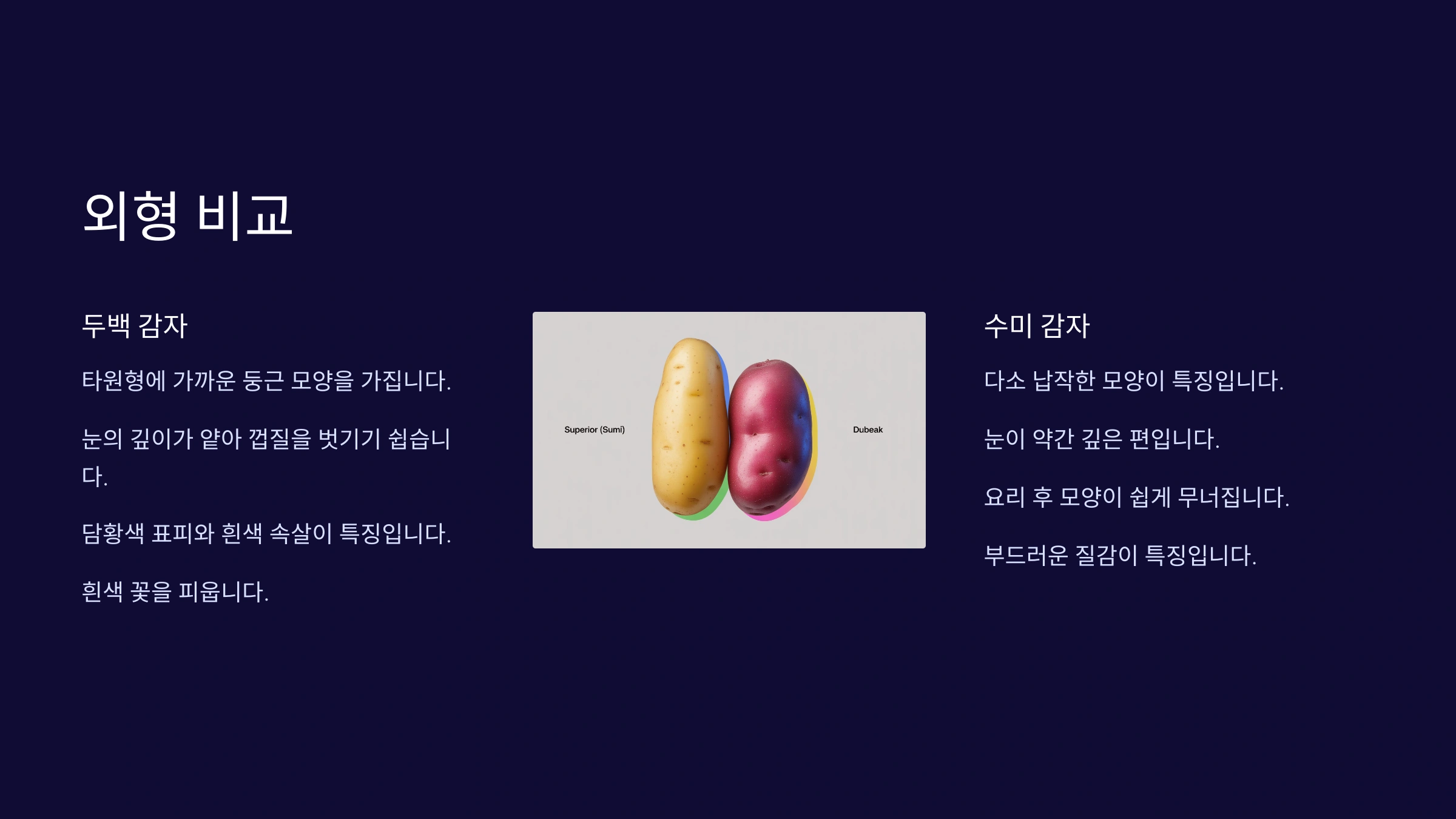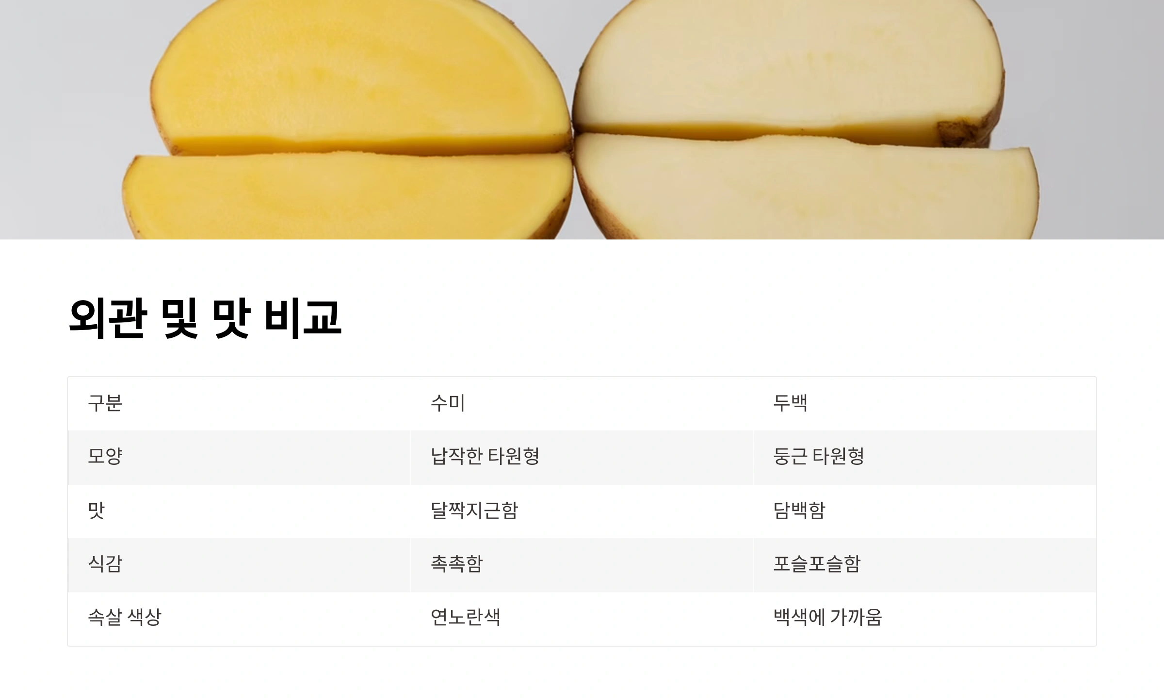 | 구분 | 수미(秀美) 감자 | 두백(두백) 감자 |