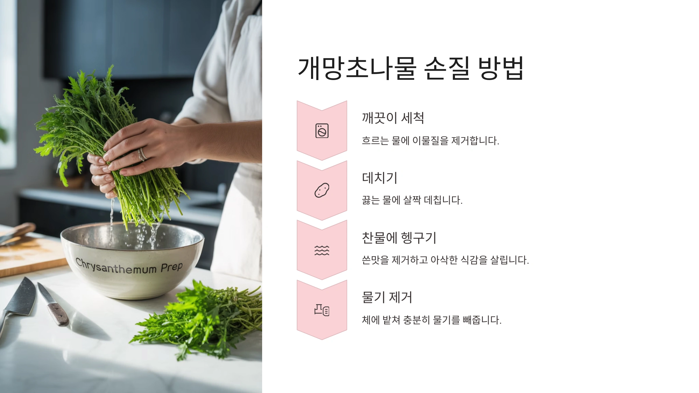 - 물기 제거: 데친 개망초는 찬물에 재빨리 헹궈 열기를 식힌 후, 물기를 손으로 꼭 짜줍니다.