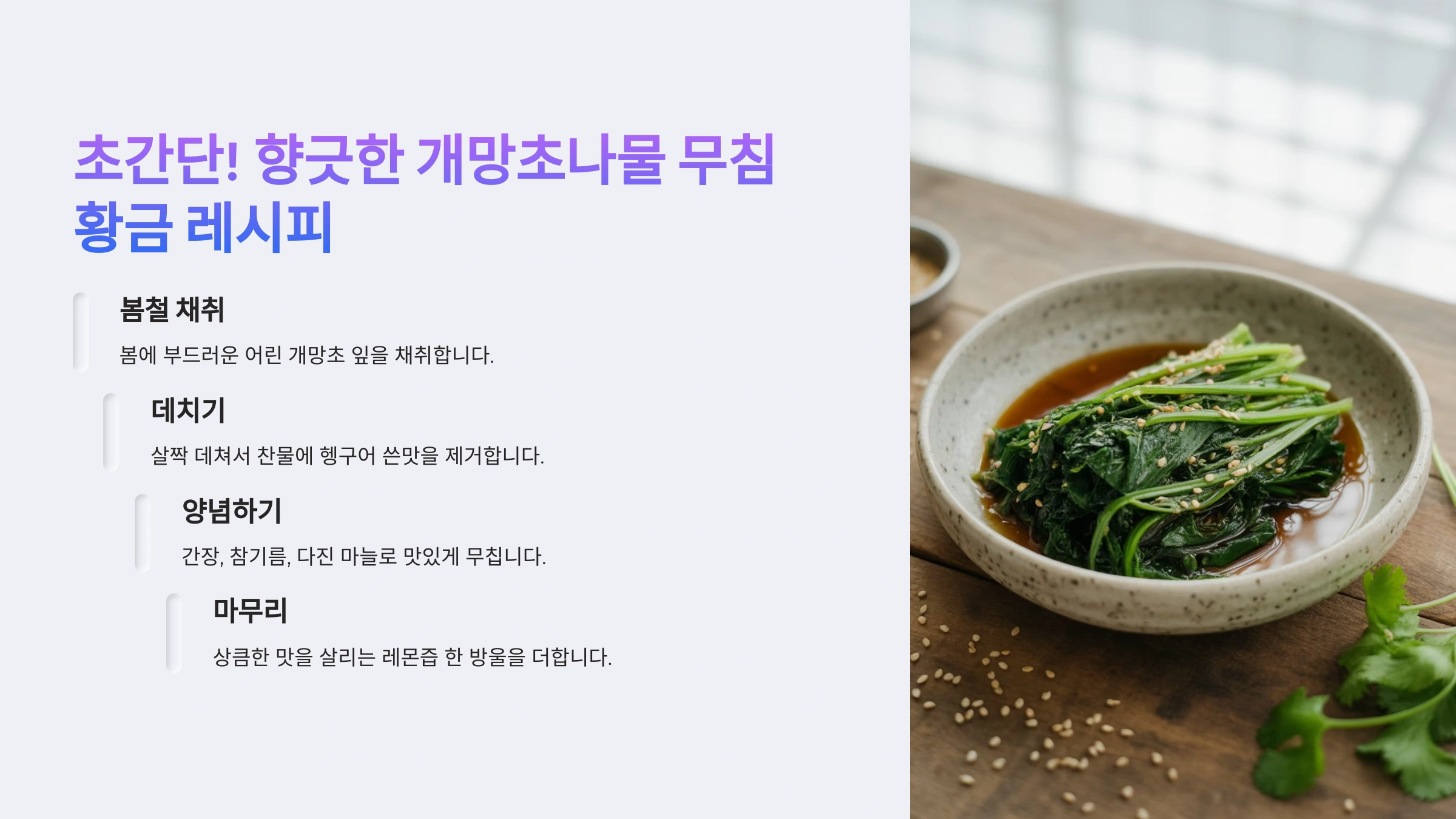 - 양념하기: 볼에 데친 개망초와 준비한 양념(다진 마늘, 다진 파, 국간장, 참기름, 깨소금)을 모두 넣고 조물조물 맛있게 무쳐주면 완성! 간은 기호에 맞게 조절하세요.