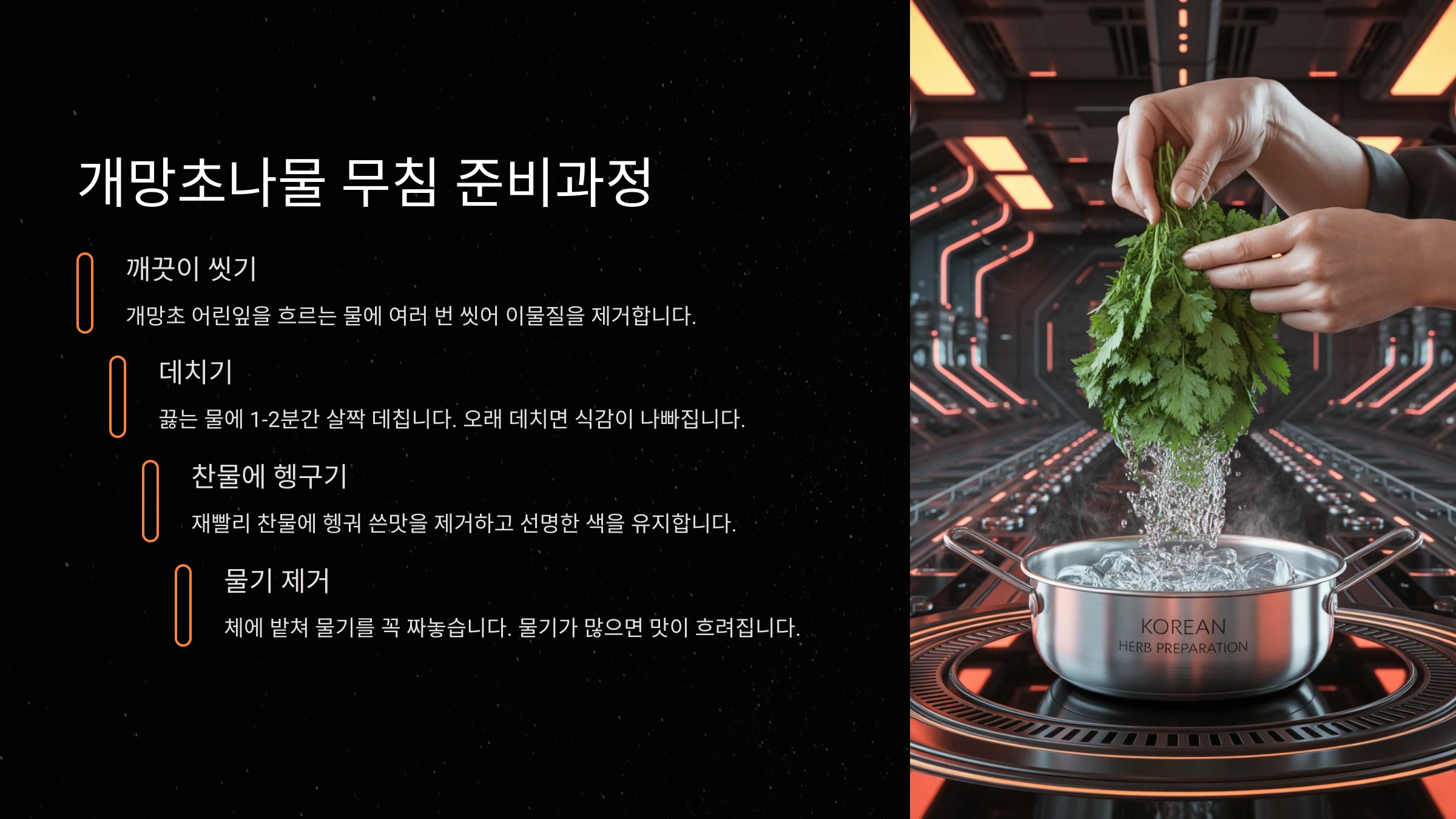 - 손질 및 데치기: 개망초 어린 순을 깨끗이 다듬어 씻은 후, 끓는 물에 소금을 약간 넣고 30초~1분 정도 살짝 데쳐주세요. 너무 오래 데치면 물러지니 주의! (쓴맛을 줄이고 싶다면 데친 후 찬물에 잠깐 담가두었다가 헹궈도 좋아요.)