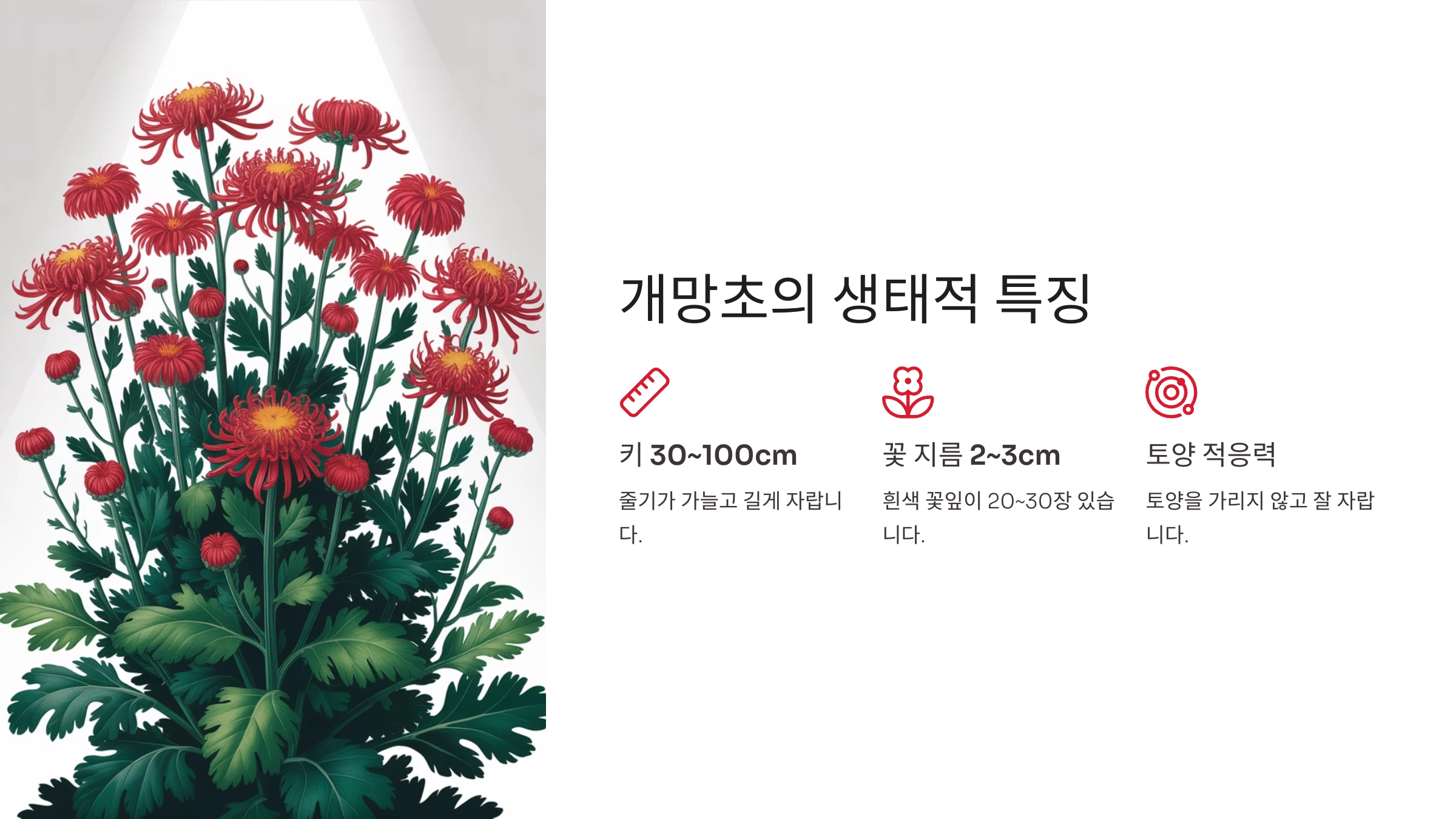 개망초는 키가 30cm에서 크게는 1m까지 자라고, 줄기 윗부분에서 가지가 많이 갈라져 여러 개의 꽃이 함께 피어나는 것이 특징이에요. 번식력도 엄청나서 한번 자리를 잡으면 금세 주변을 하얗게 뒤덮기도 한답니다. 여름날 뜨거운 햇볕 아래에서도 꿋꿋하게 피어있는 모습이 참 대견하죠?