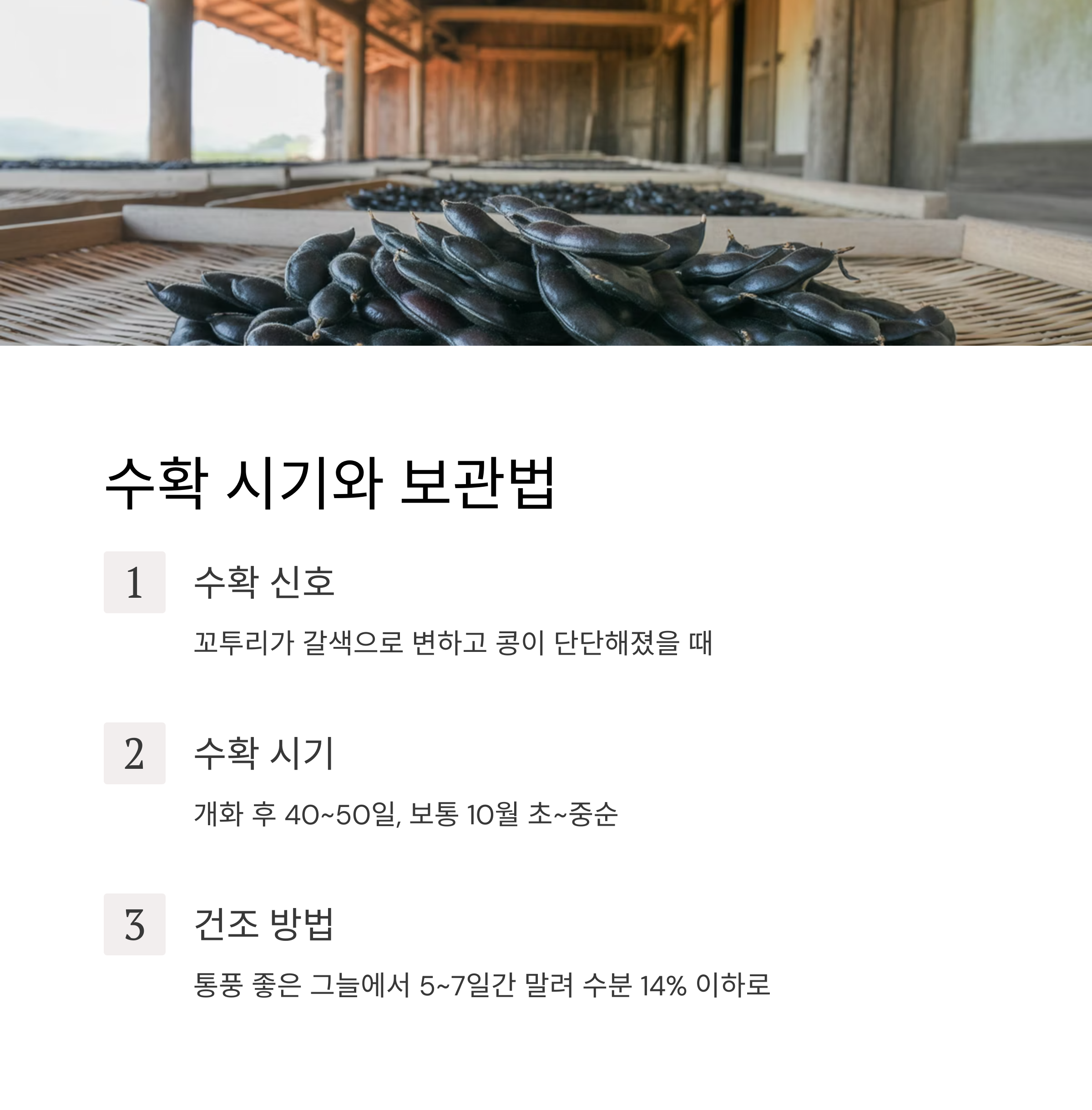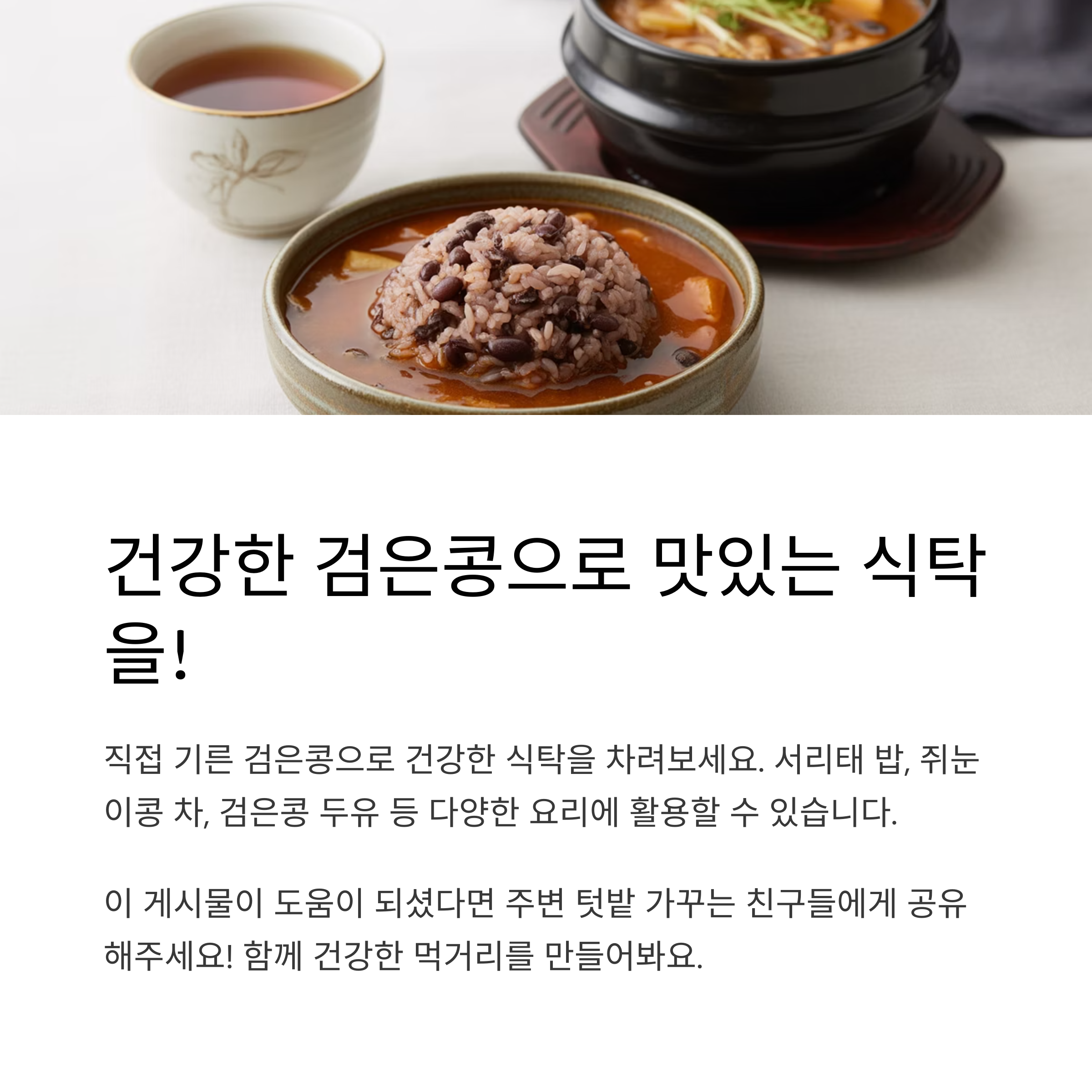 | 흑대두 | 일반 검정콩, 재배 쉬움 | 두유, 간식, 볶음 |