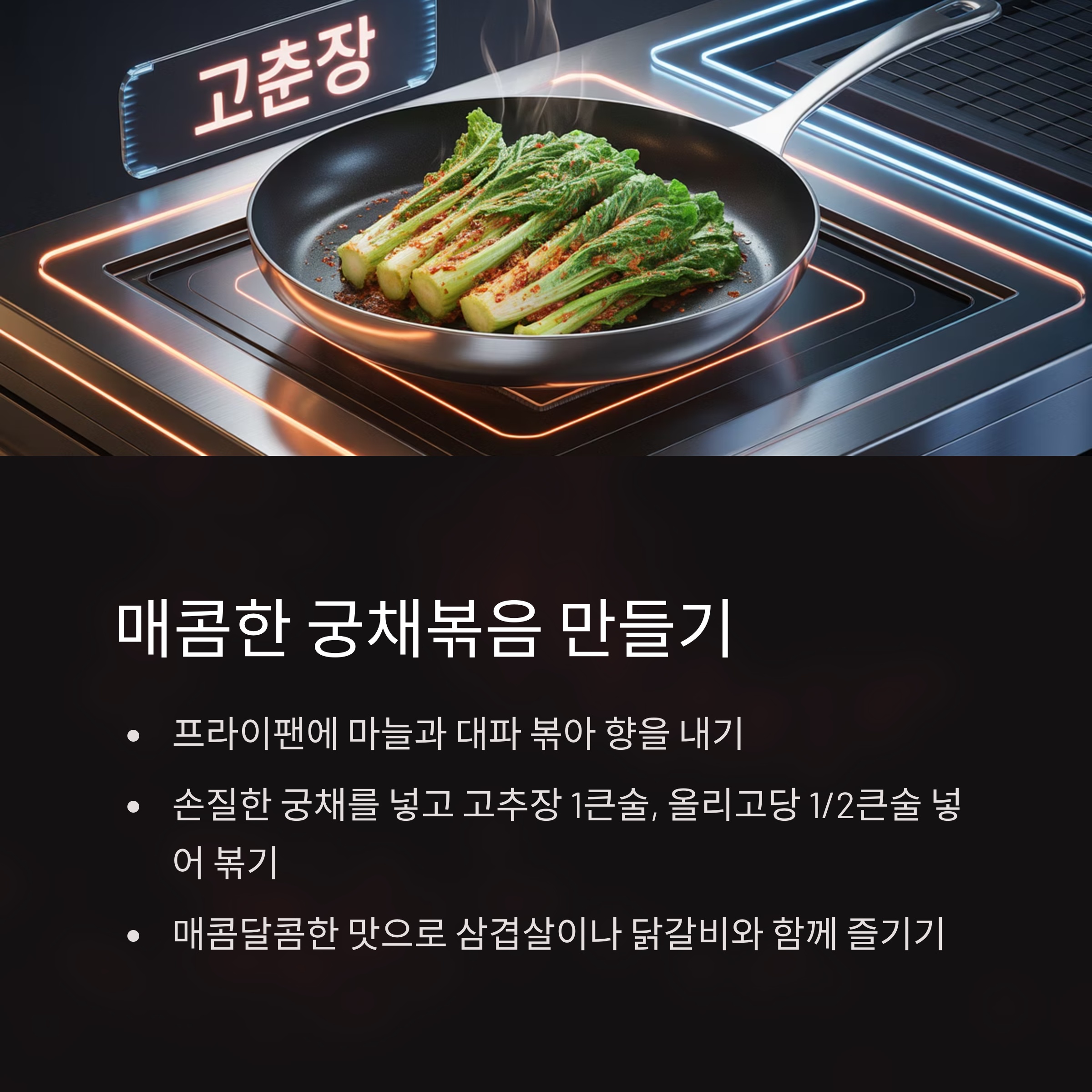 재료: 생 궁채(또는 불린 건조 궁채), 고추장, 올리고당, 마늘, 대파, 식용유