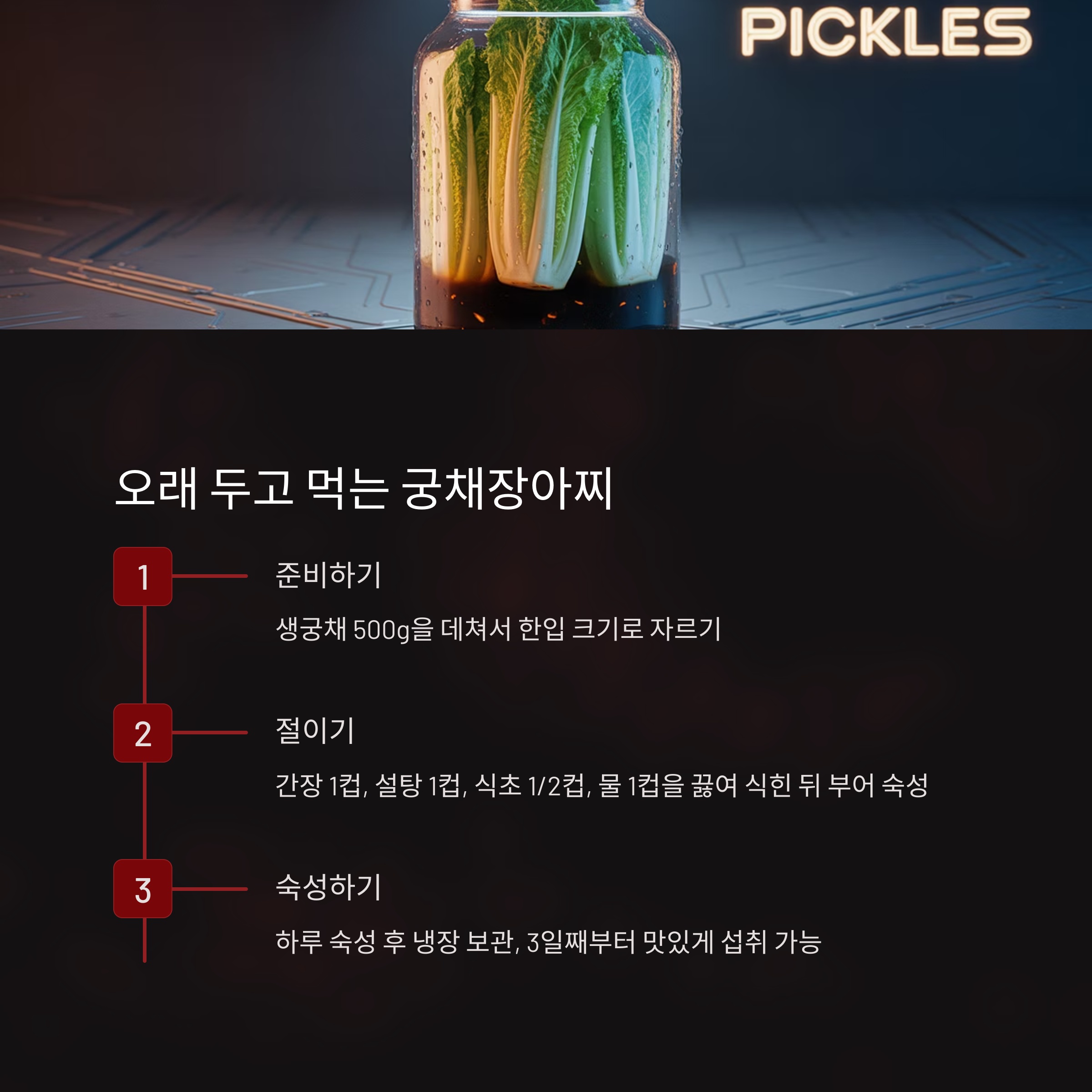 - 간장·설탕·식초·물을 끓여 식힌 뒤 부어 숙성