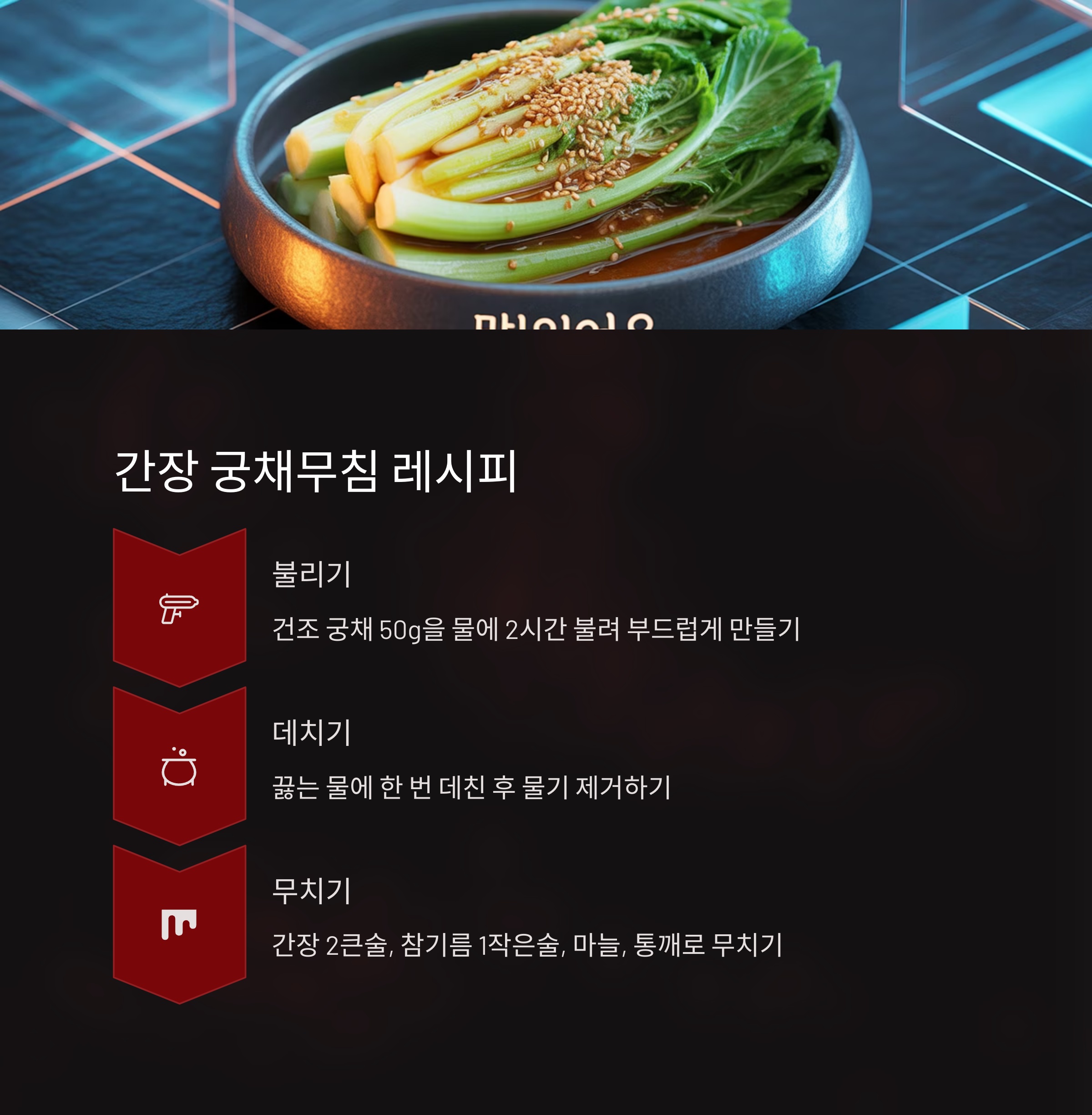 재료: 건조 궁채 50g, 간장 2큰술, 참기름 1작은술, 마늘, 통깨, 고춧가루(선택)