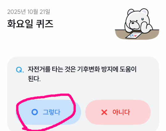- 앱 실행 → ‘활동’ 탭 → ‘기후퀴즈’ 선택
