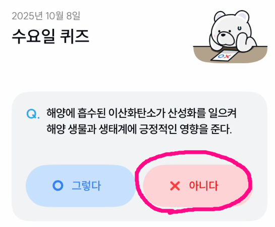 앱 내 ‘오늘의 퀴즈’ 또는 ‘기후 퀴즈’ 섹션에서 매일 출제되는 문제를 확인합니다