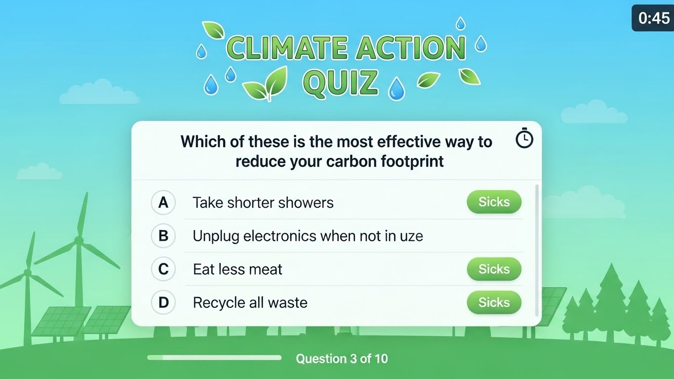 오늘의 퀴즈는 일상 속 탄소 배출을 줄이는 방법이나 환경 상식에 대해 묻는 문제가 주로 출제됩니다.