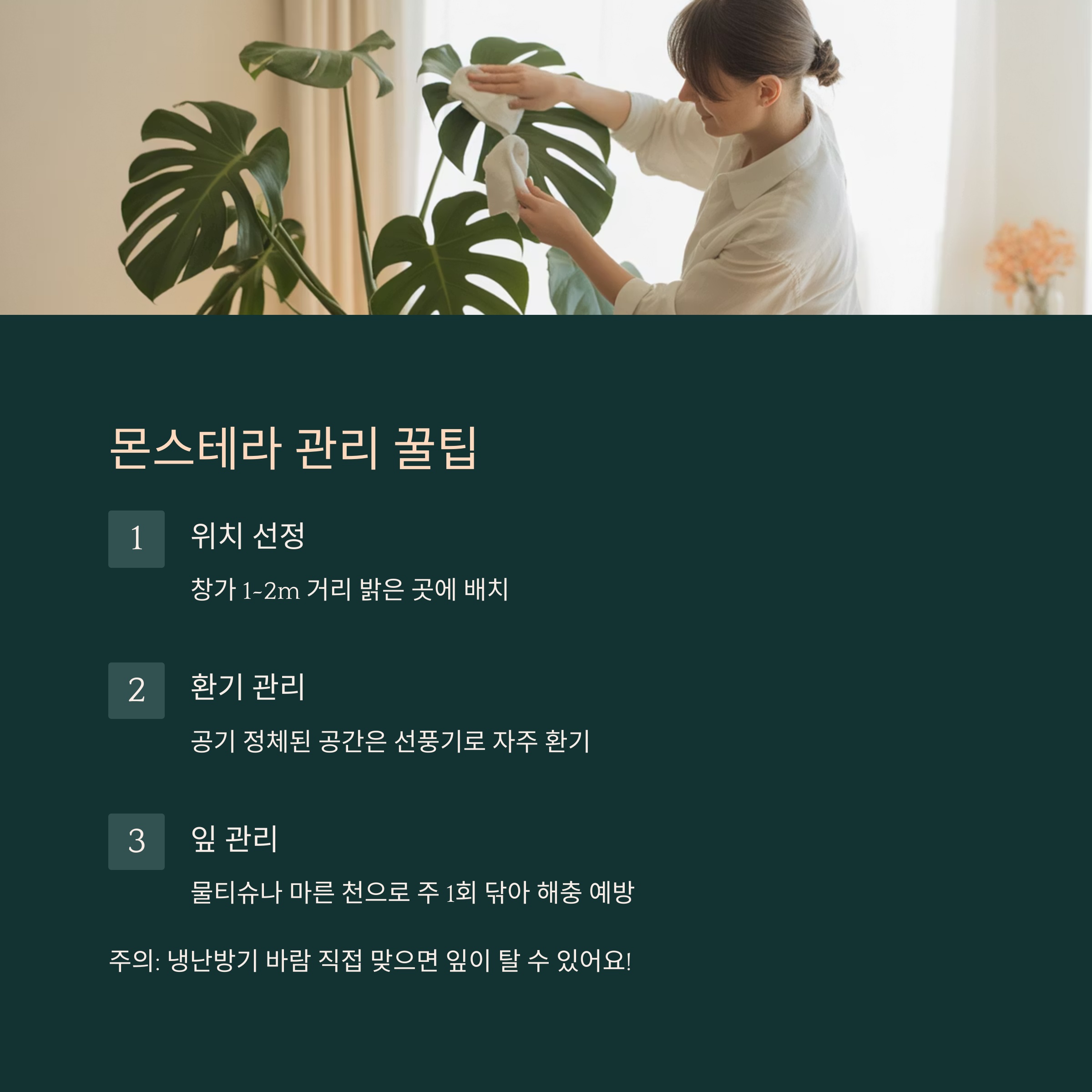 - 잎은 물티슈나 마른 천으로 주 1회 닦기 → 해충 예방