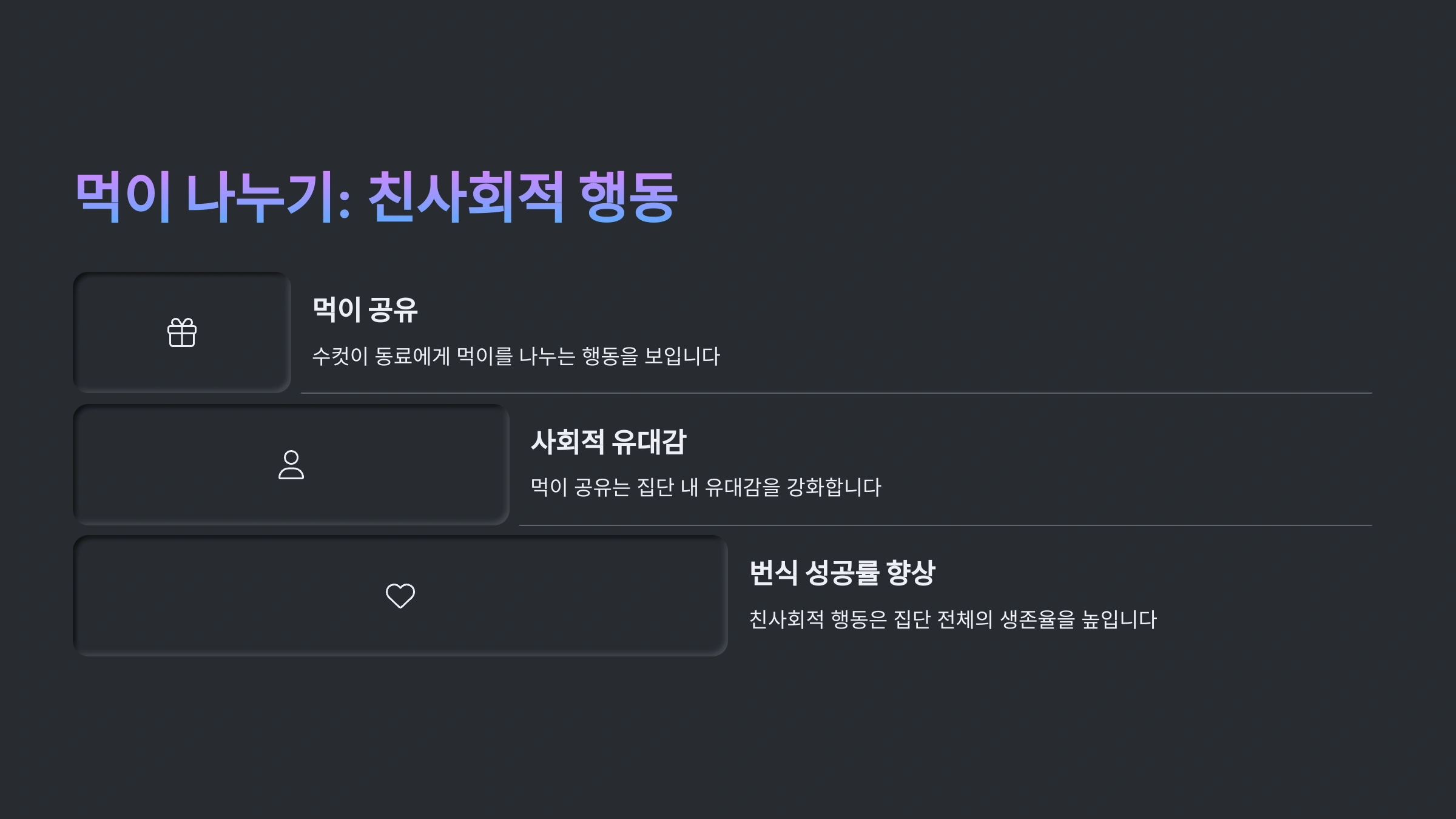| 위협 반응 | 몸짓, 소리로 위협하며 공격 |