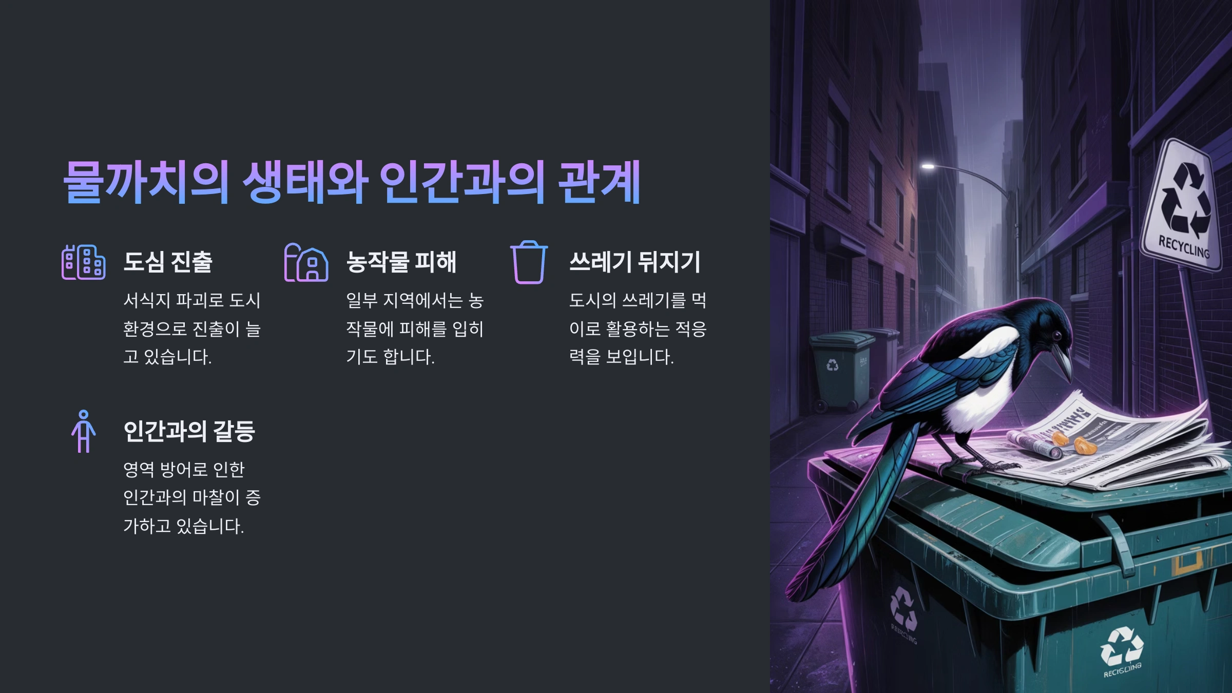 하지만 이로 인해 사람과의 갈등도 발생해요. 예를 들어, 물까치가 사람 음식을 훔쳐가거나, 번식기에 둥지를 보호하기 위해 공격성을 드러내는 일이 생기거든요. 이런 갈등을 줄이려면 사람도 물까치의 습성과 번식기를 이해하고 서로 안전거리를 유지하는 게 중요해요.