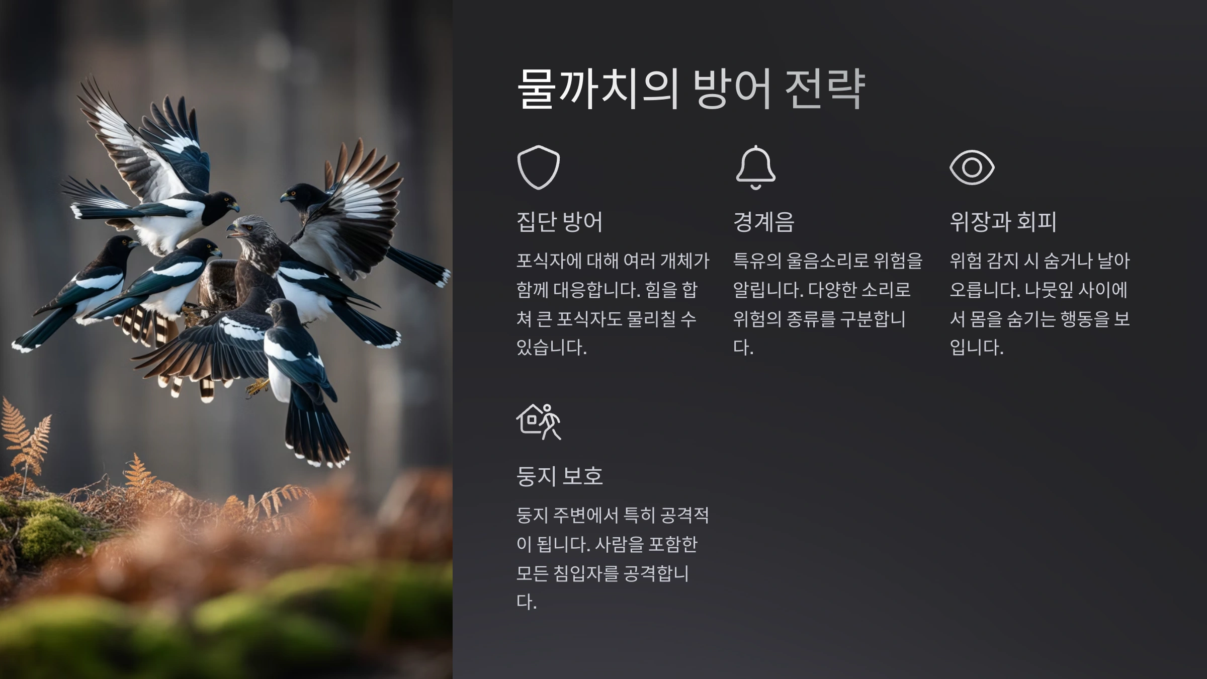 물까치가 때로 사람을 공격하는 모습에 놀라신 분들 많으셨을 거예요.😊 사실 물까치는 본능적으로 둥지를 보호하려는 행동을 하며, 이때 사람에게 공격성을 보이는 경우가 있어요.