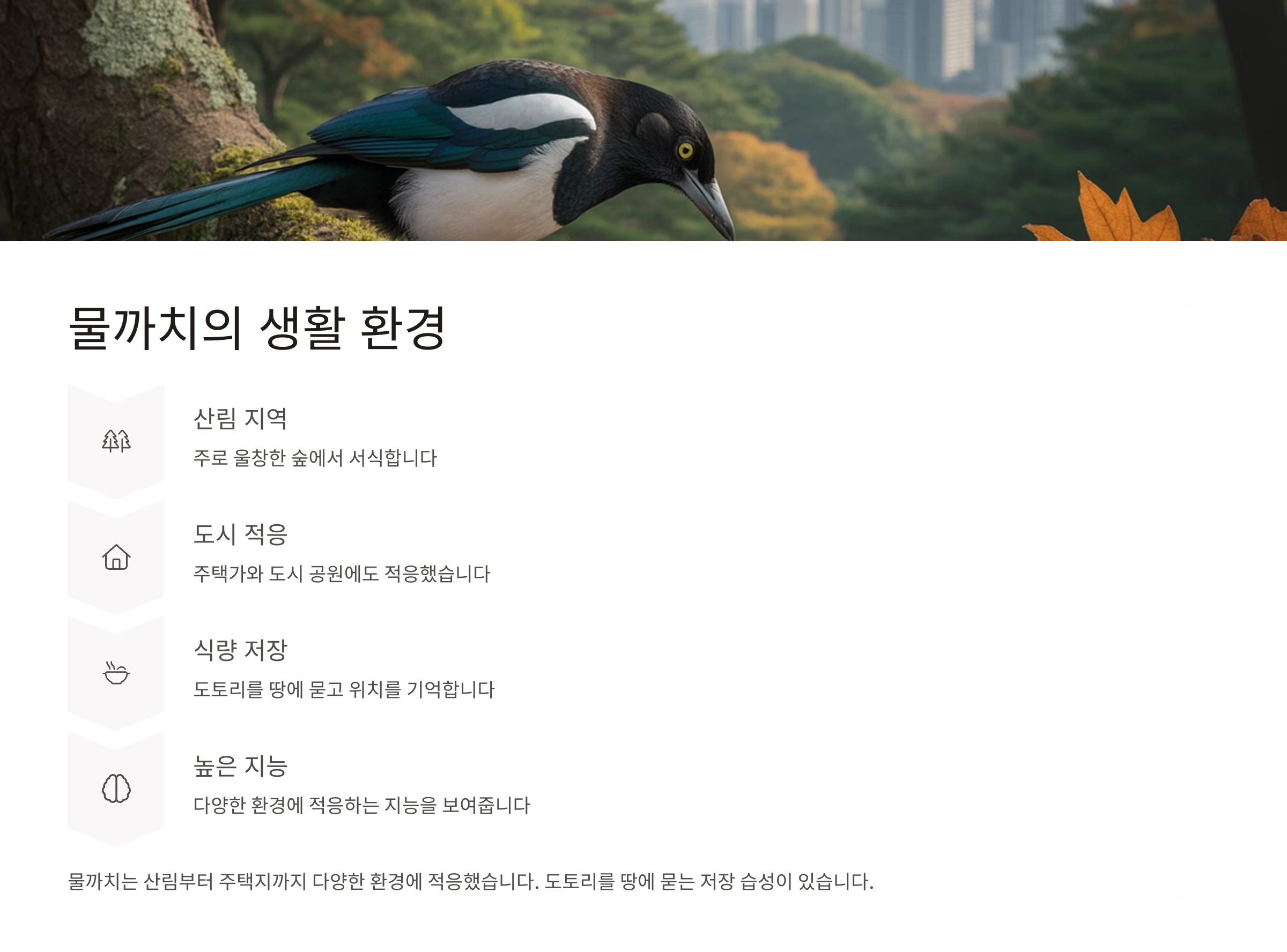 특히 사람 주위에 둥지를 틀면 음식물 쓰레기나 인공구조물 등 새로운 먹이 자원과 보호처를 쉽게 찾을 수 있어요. 이는 물까치가 사람 곁에서 살아가는데 유리한 요소가 된답니다.