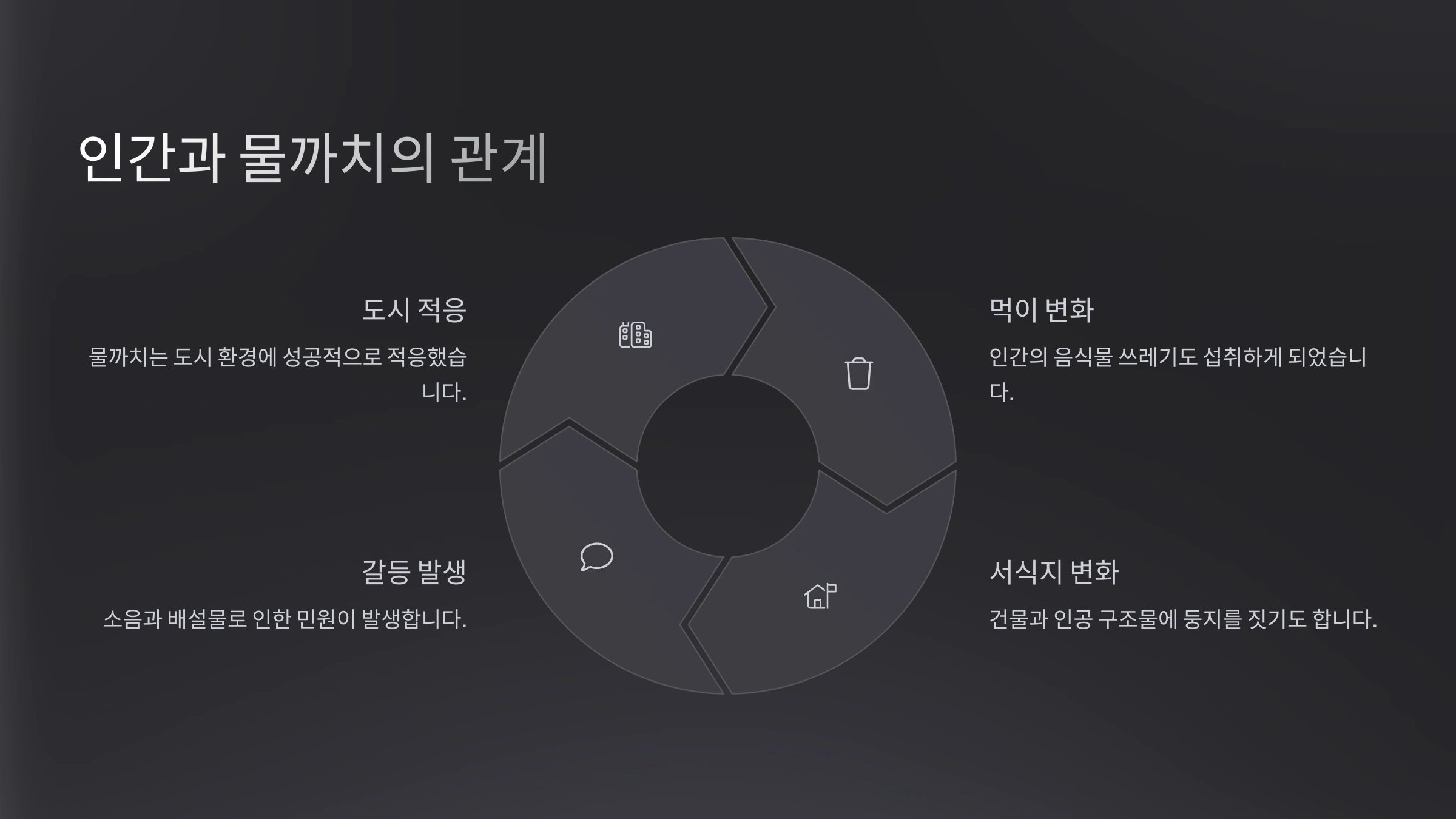 | 도심 적응 | 사람 행동에 익숙해져 대담해짐 |