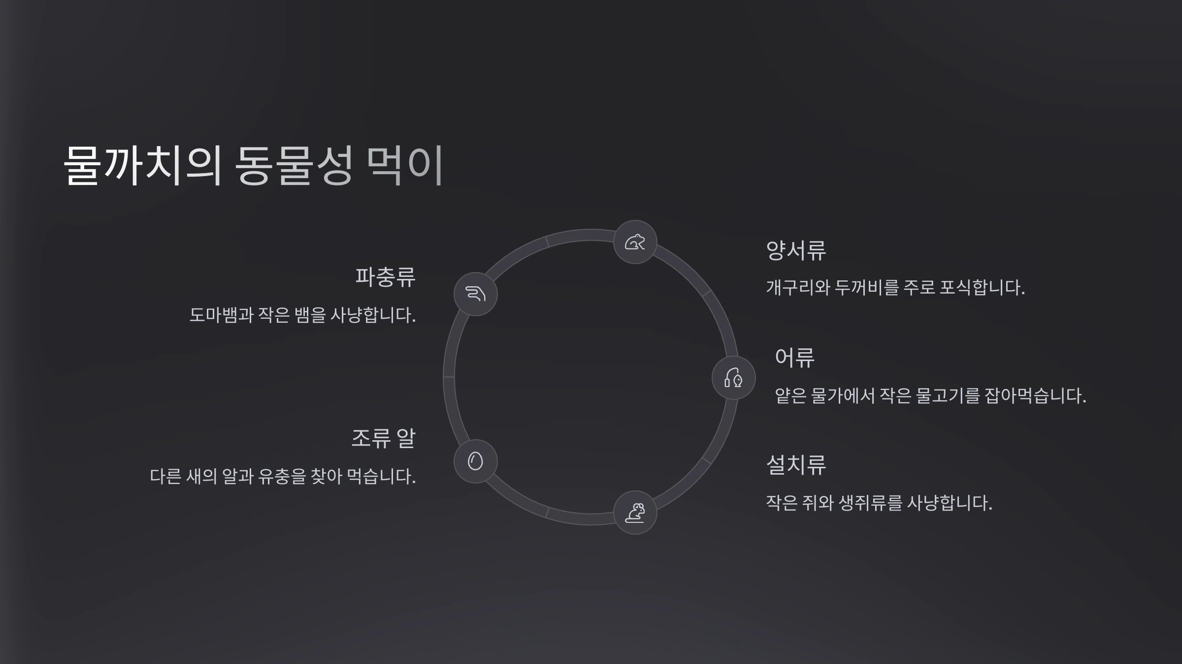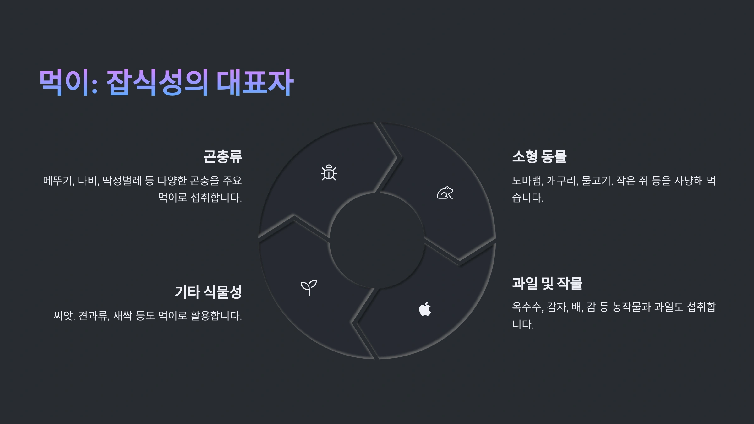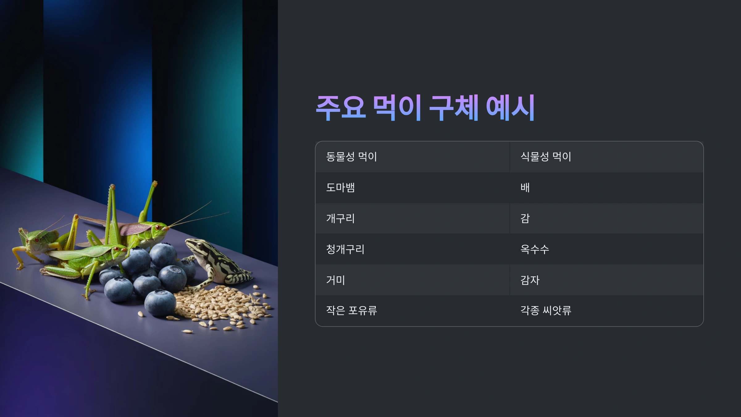 | 곤충류 | 애벌레, 딱정벌레, 메뚜기 등 |
