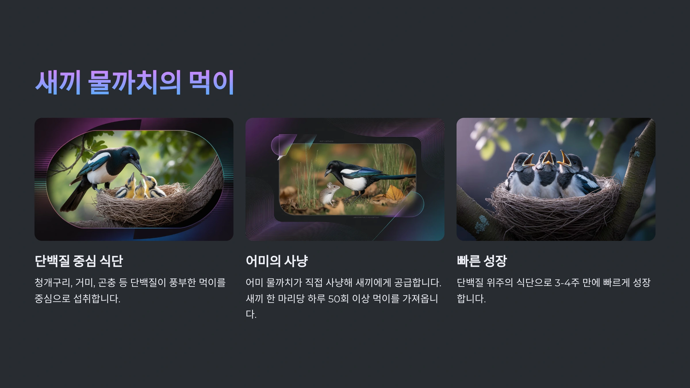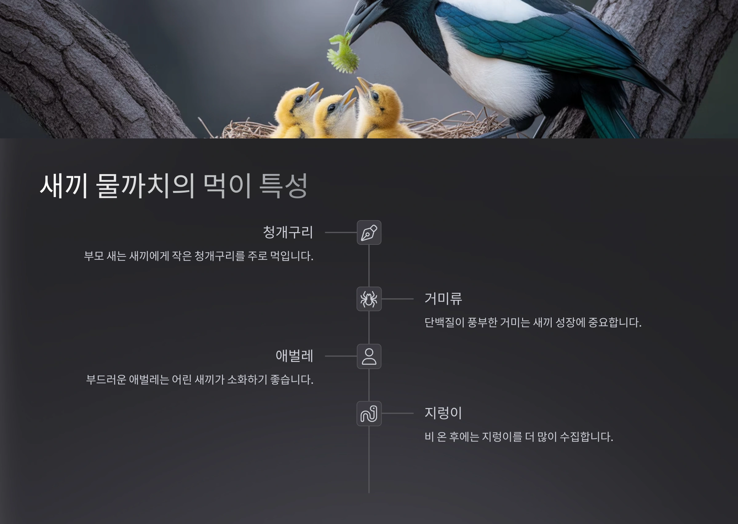 | 기타 | 음식물 찌꺼기, 새의 알과 새끼새 |