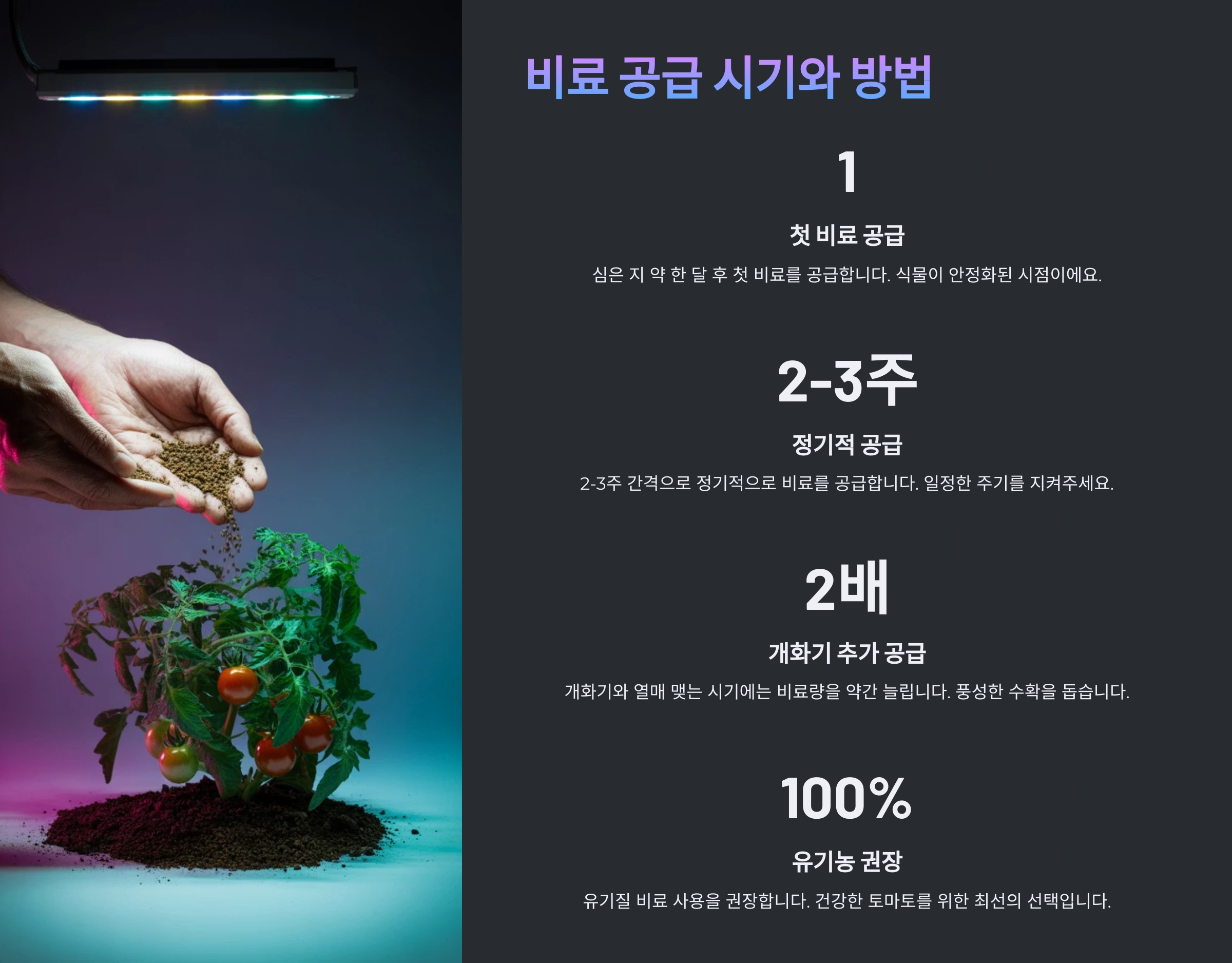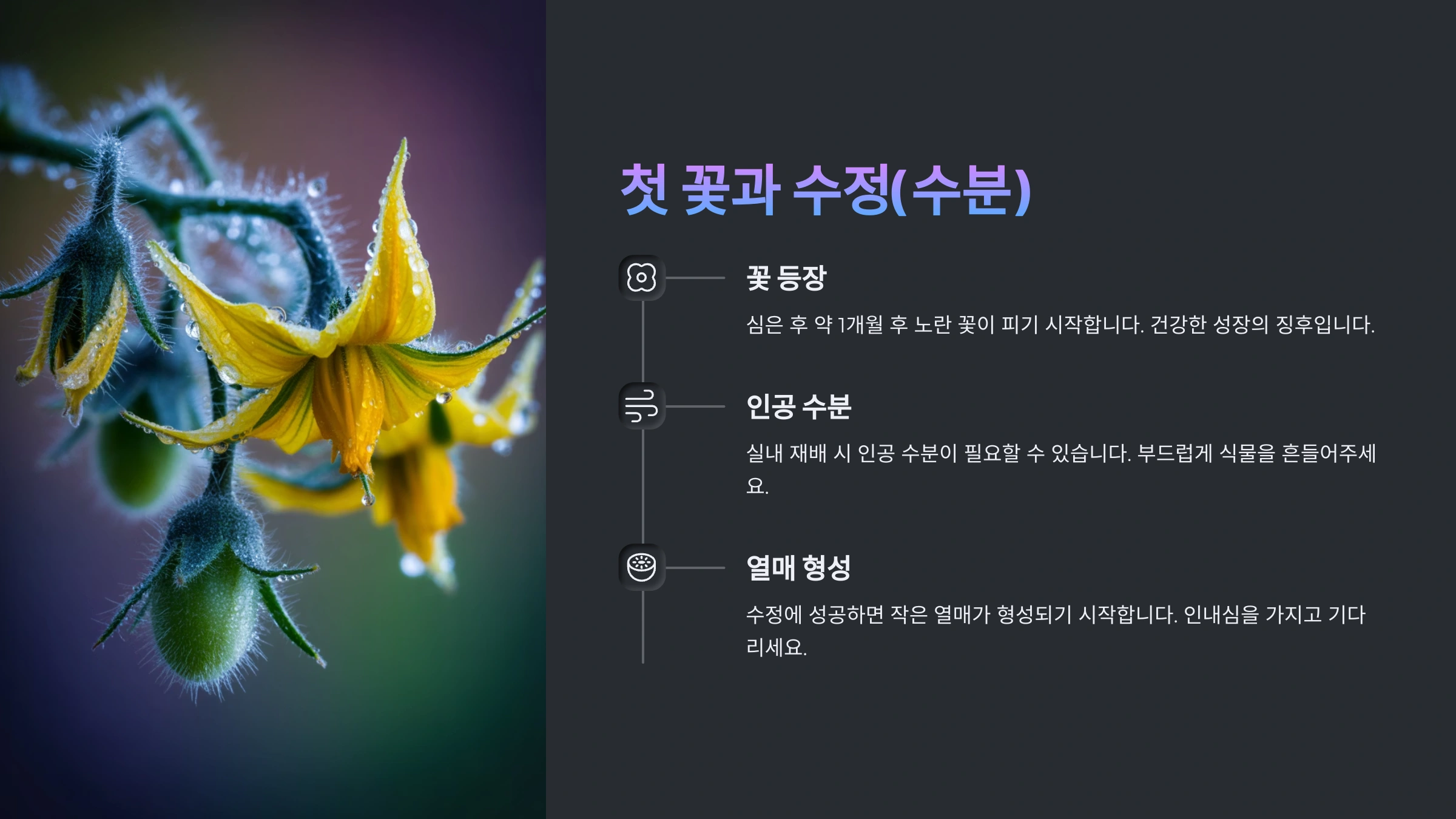 모종이 아직 작고 연약하다면, 첫 번째, 그리고 두 번째 꽃송이까지는 제거해주는 것을 추천해요. 식물 전체의 튼튼한 성장을 위한 투자라고 생각하시면 된답니다. 만약 아주 튼튼하고 건강한 모종이라면 그대로 두어 조금 더 빨리 첫 수확의 기쁨을 맛보는 것도 괜찮아요!