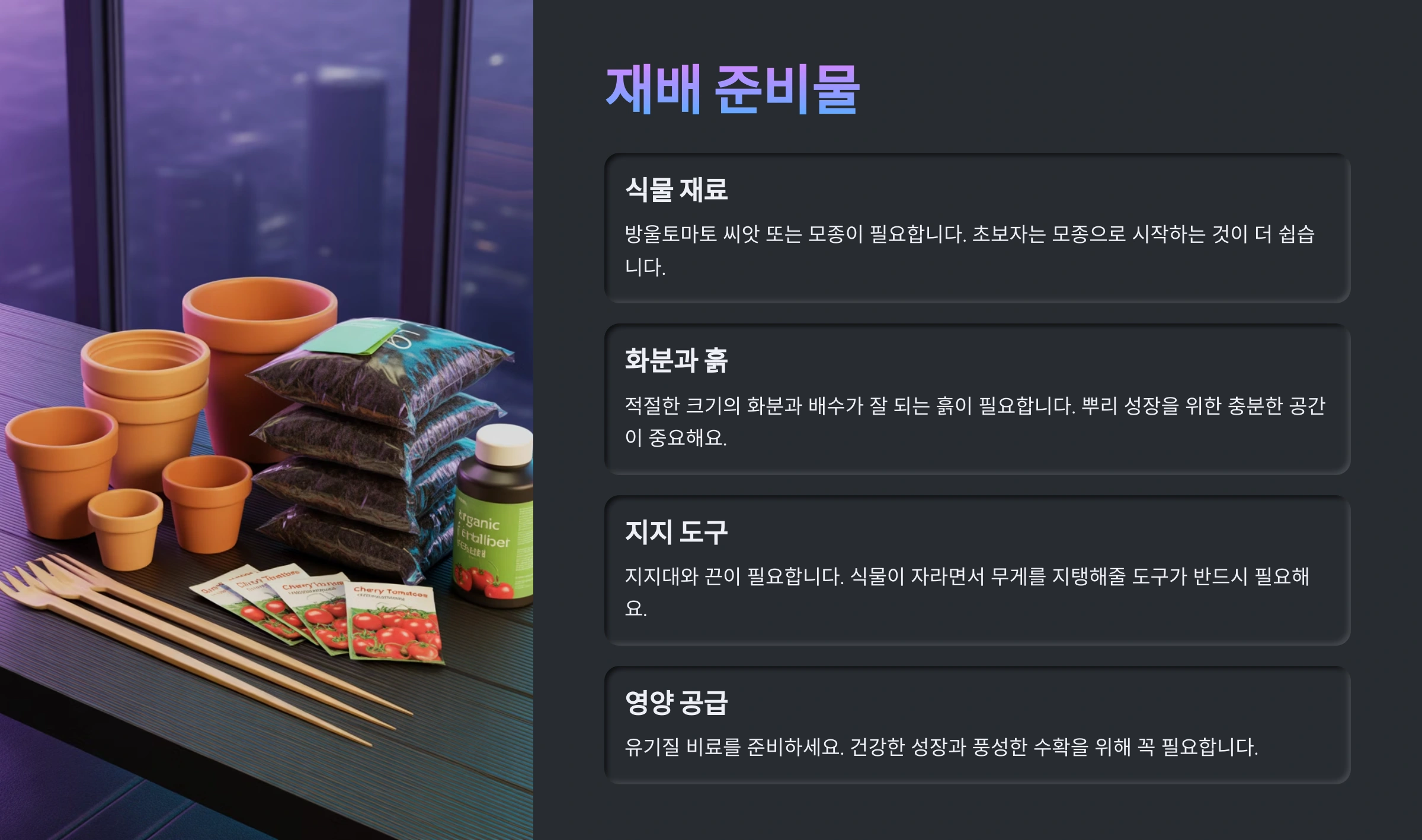 어느덧 방울토마토 키가 훌쩍 자랐나요? 이제는 스스로 몸을 가누기 힘들어할 시기예요. 방울토마토 줄기는 연약해서 열매의 무게를 이기지 못하고 쉽게 쓰러지거나 부러질 수 있거든요. 그래서 튼튼한 지지대를 세워주는 작업이 필수적입니다.