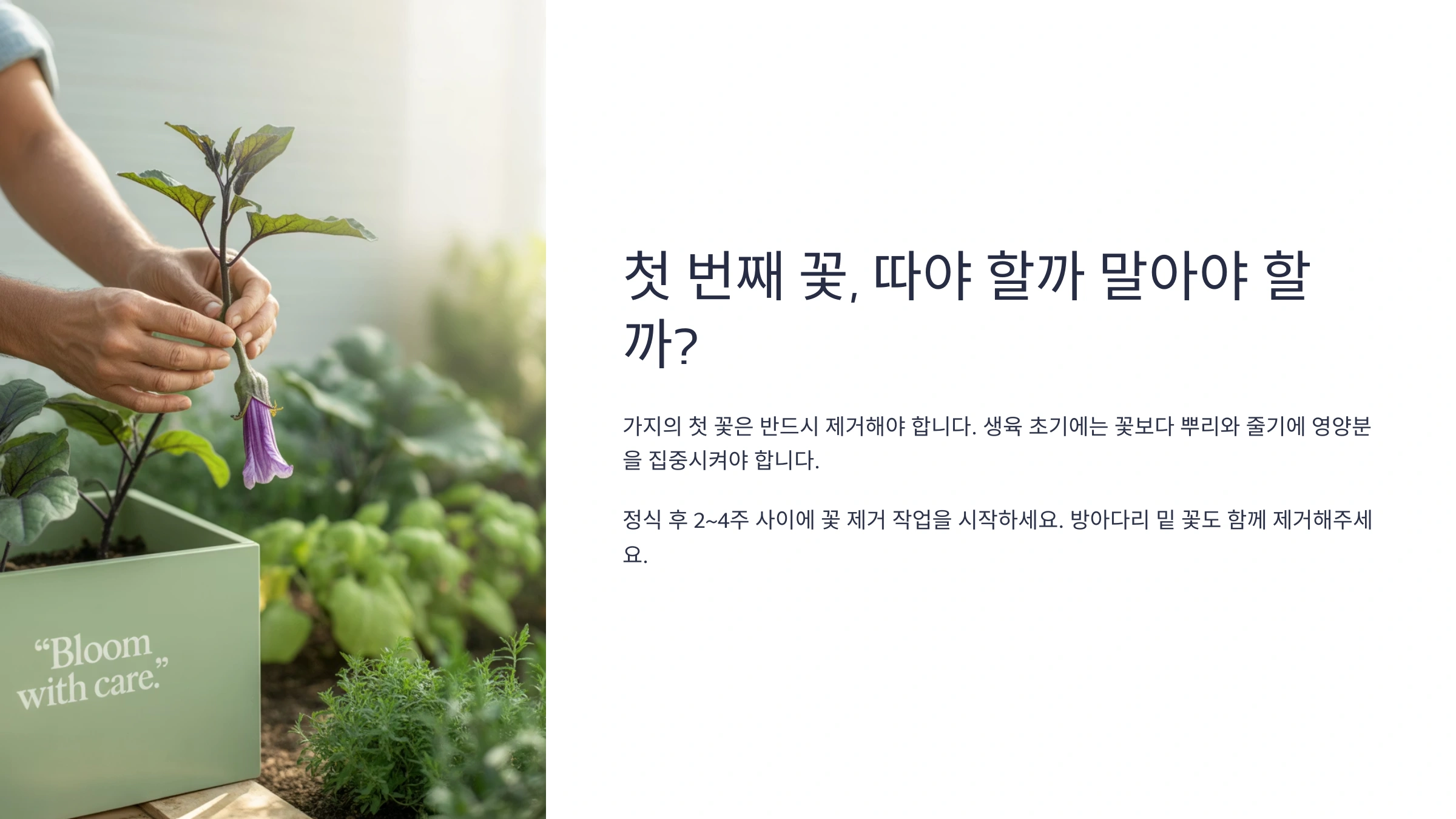 모종이 아직 작고 연약하다면, 첫 번째, 그리고 두 번째 꽃송이까지는 제거해주는 것을 추천해요. 식물 전체의 튼튼한 성장을 위한 투자라고 생각하시면 된답니다. 만약 아주 튼튼하고 건강한 모종이라면 그대로 두어 조금 더 빨리 첫 수확의 기쁨을 맛보는 것도 괜찮아요!