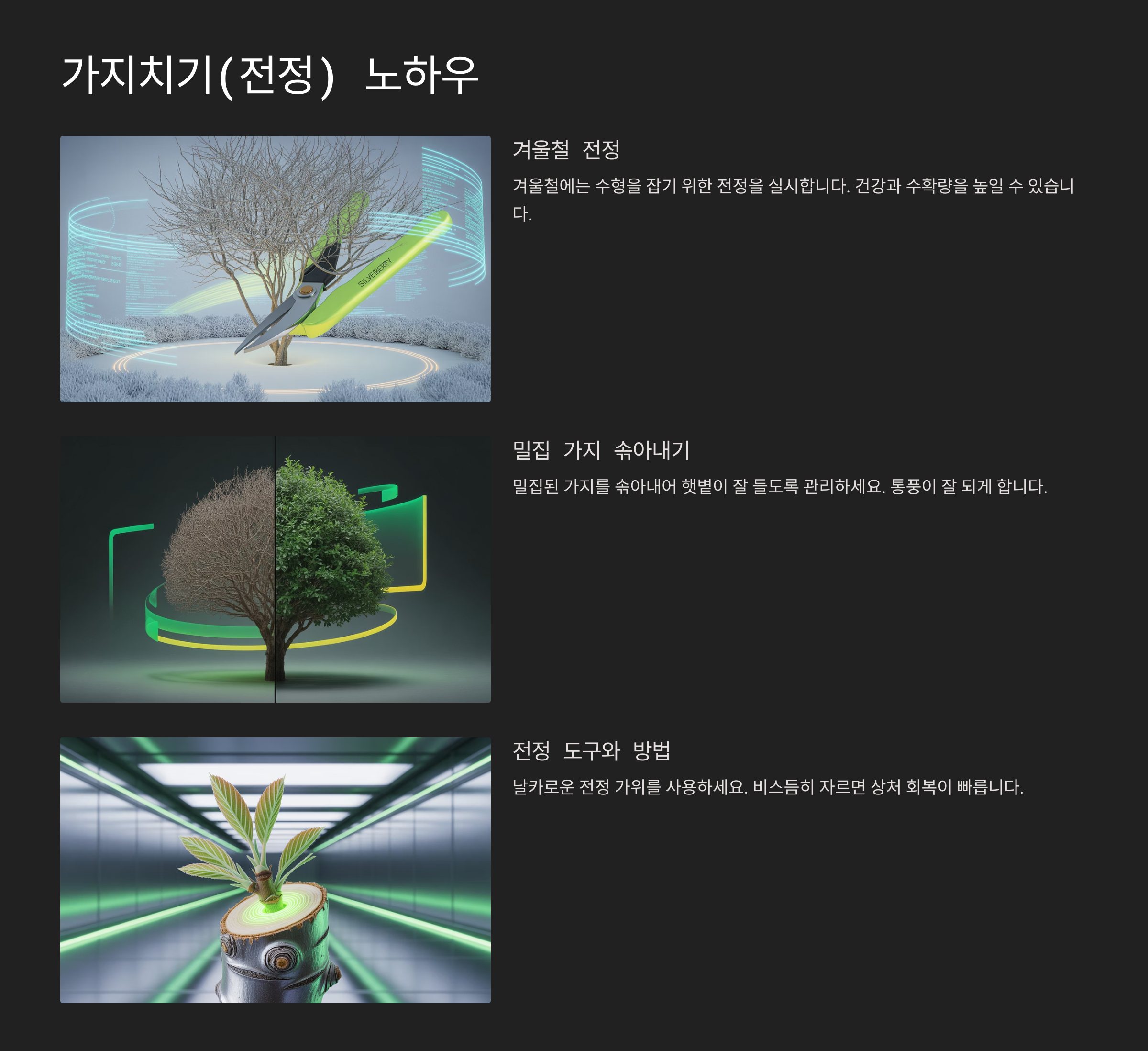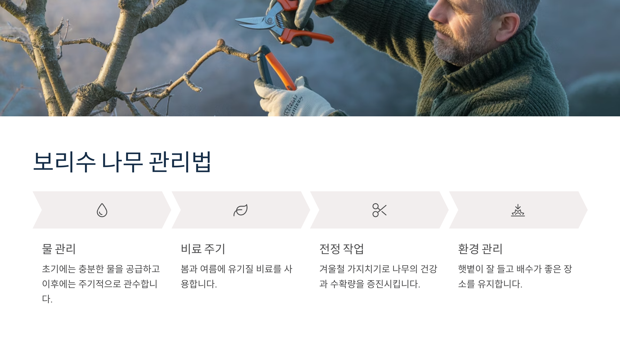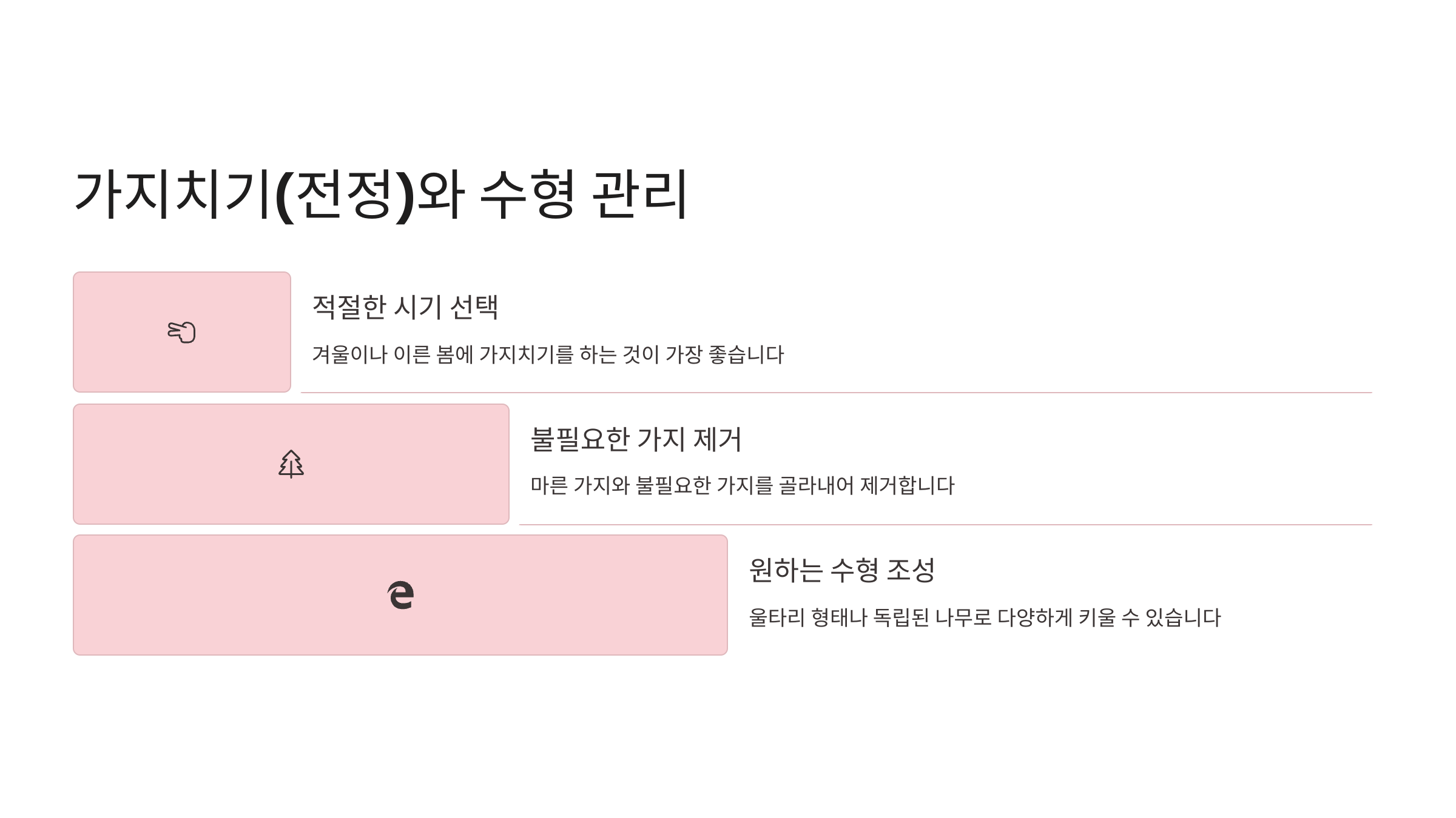 | 가지치기 | 병든 가지 제거 | 겨울~초봄 | 무리한 자르기 금지 | 통풍 확보 |