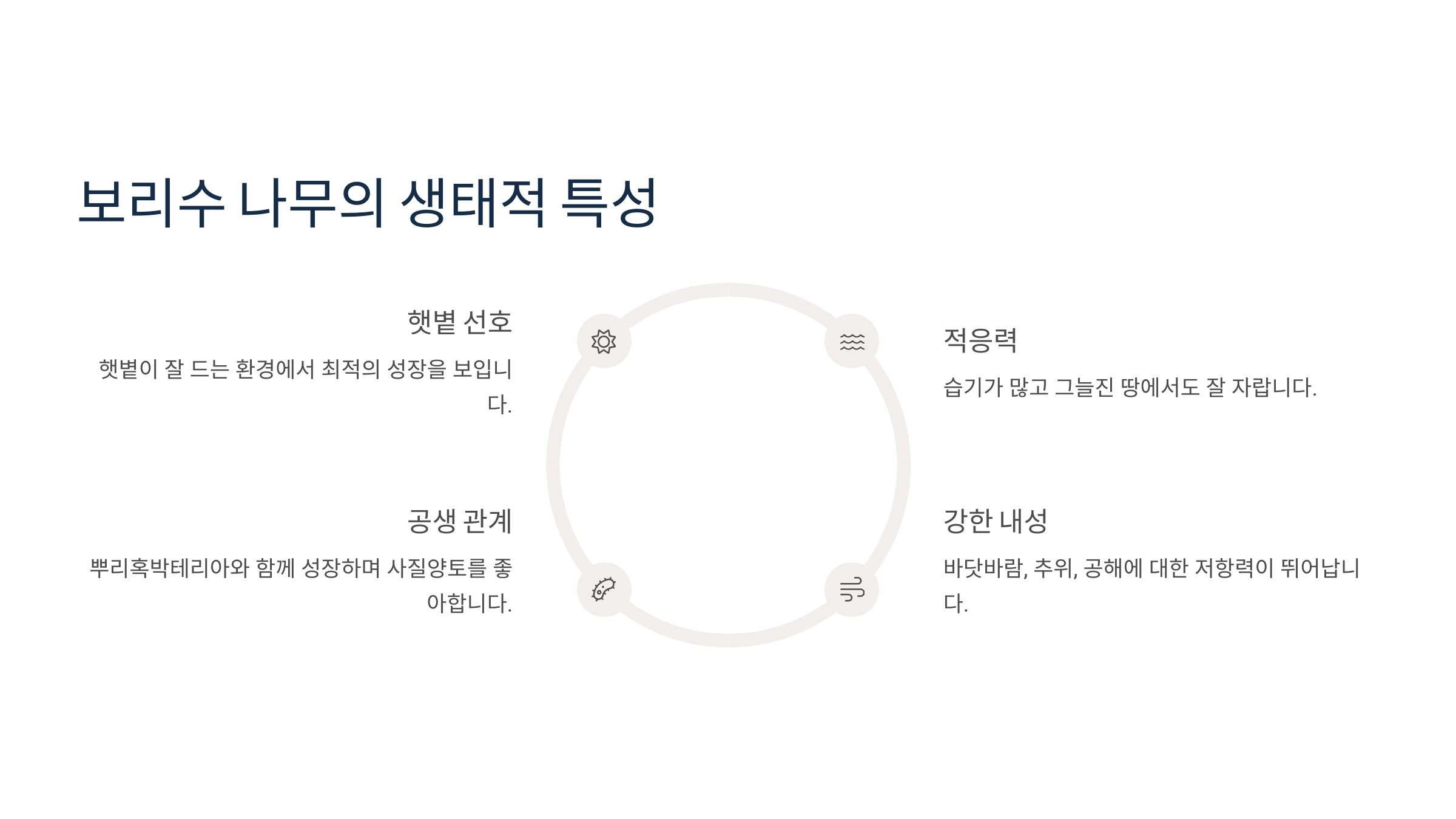 | 마을 수호목 | 정자나 마을 입구에 식재 | 평화, 안식 | 마을 심볼 | 전통 문화 |