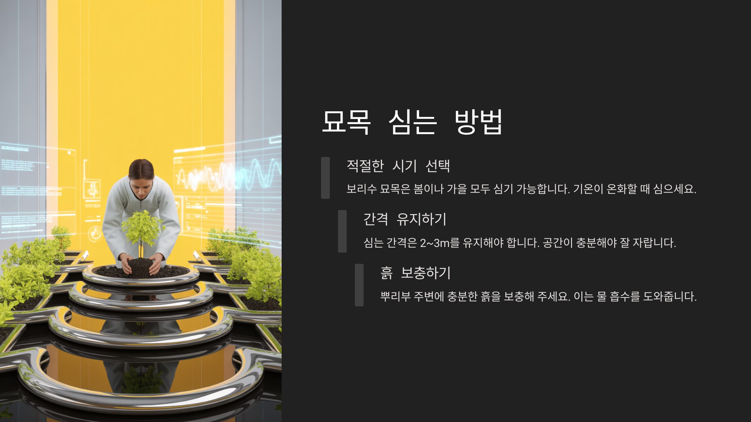 묘목을 심을 때는 식재 구덩이를 넓게 파서 뿌리가 고루 퍼질 수 있도록 해주는 게 좋아요. 구덩이 깊이는 약 50cm 정도가 적당하고, 묘목을 넣은 후에는 뿌리 주변에 흙을 잘 채워서 흔들림이 없게 고정해줘야 해요. 물도 흠뻑 주면서 흙을 단단히 눌러주세요. 🚿