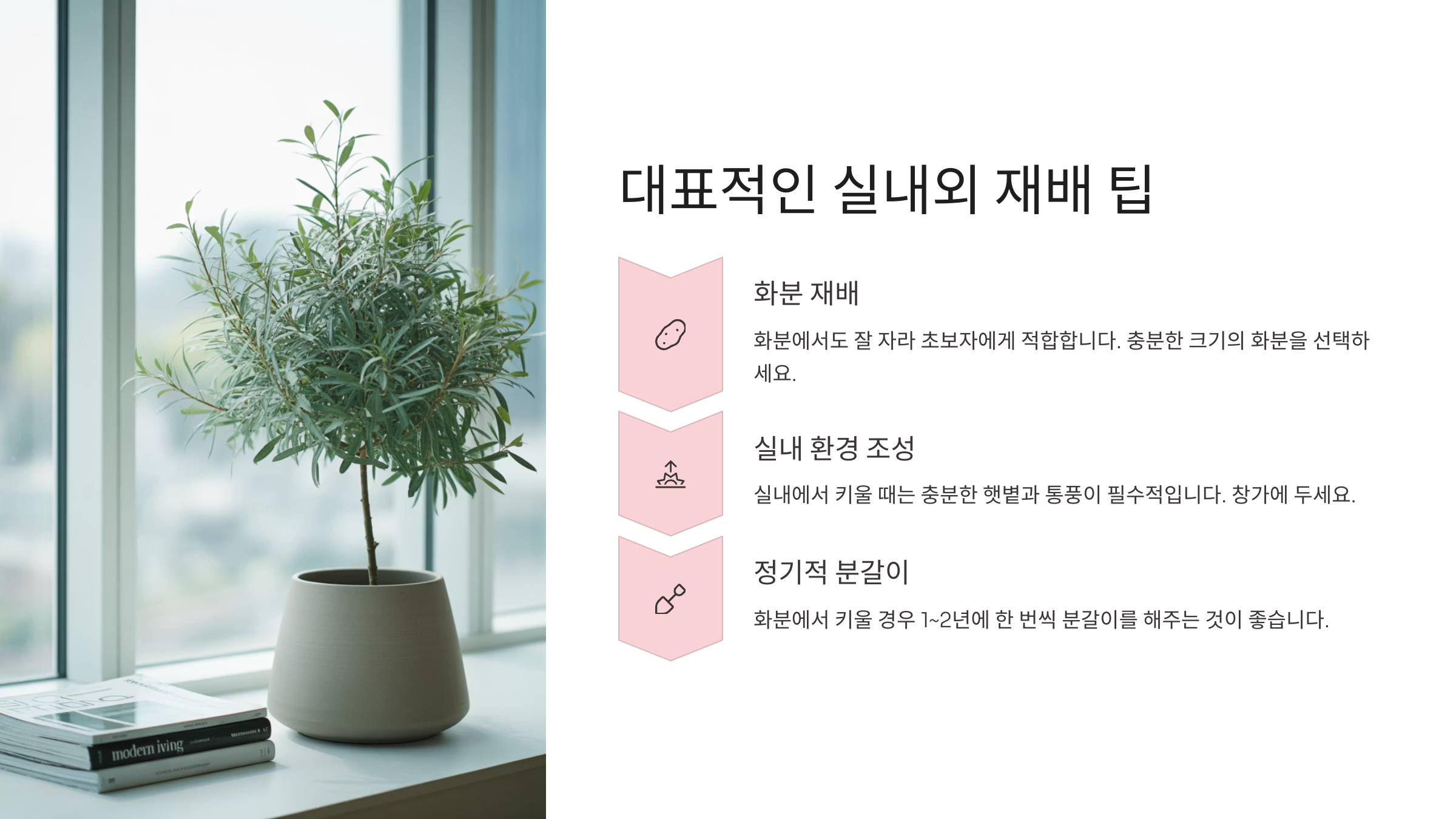 | 물주기 | 주 1회, 여름엔 주 2회 | 연중 | 배수 관리 | 장마철 물빠짐 체크 |