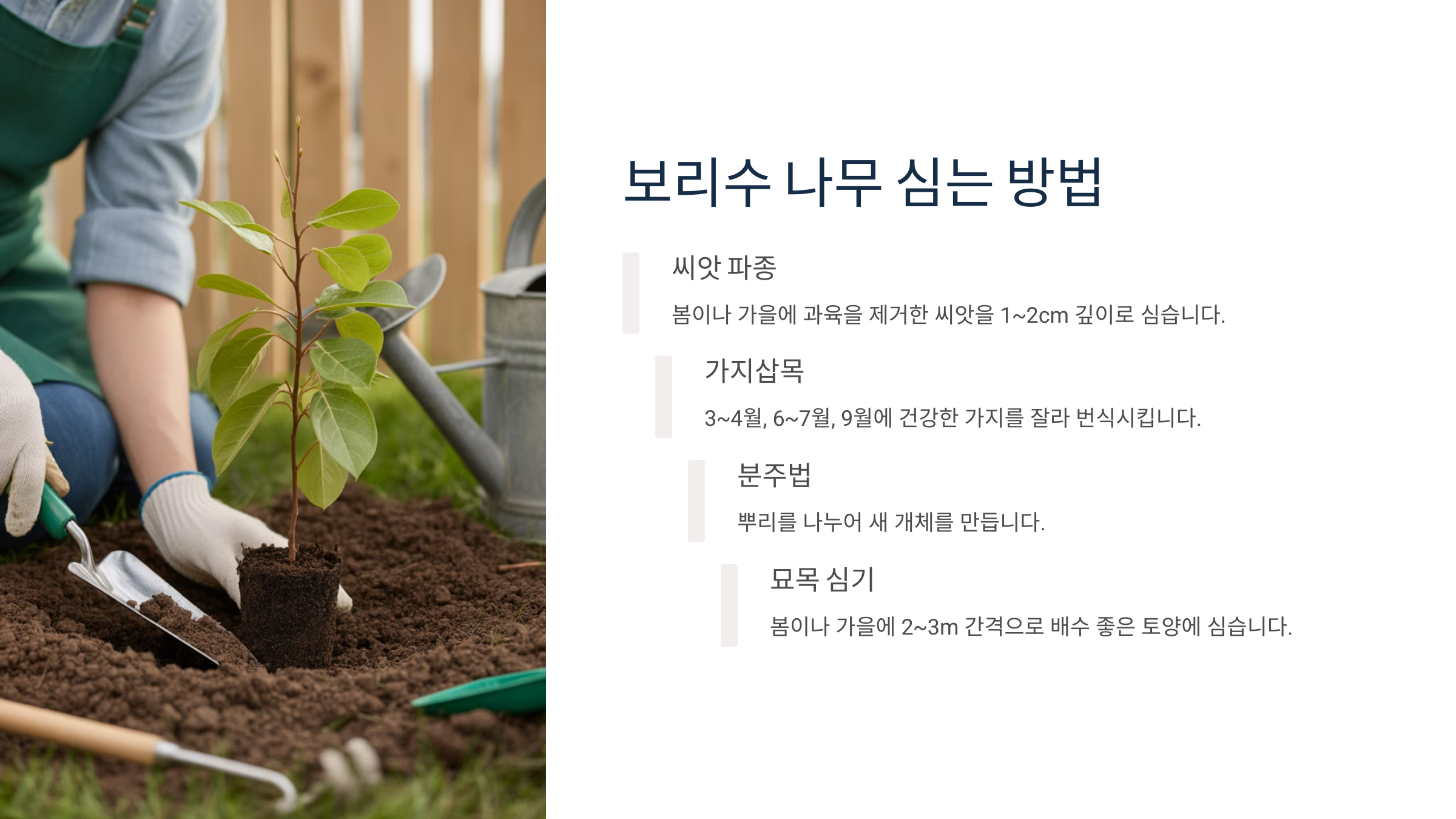 보리수 나무를 심는 건 생각보다 간단해요. 우선 보리수 나무는 햇빛을 좋아하는 나무라서 햇빛이 잘 드는 장소를 선택하는 것이 좋아요. 특히 바람이 잘 통하면서도 너무 강하지 않은 곳이면 더욱 좋아요. 묘목을 심을 때는 최소 2m 이상의 간격을 두어 심어야 가지가 넓게 뻗어도 서로 부딪히지 않아 건강하게 자랄 수 있어요.🌞