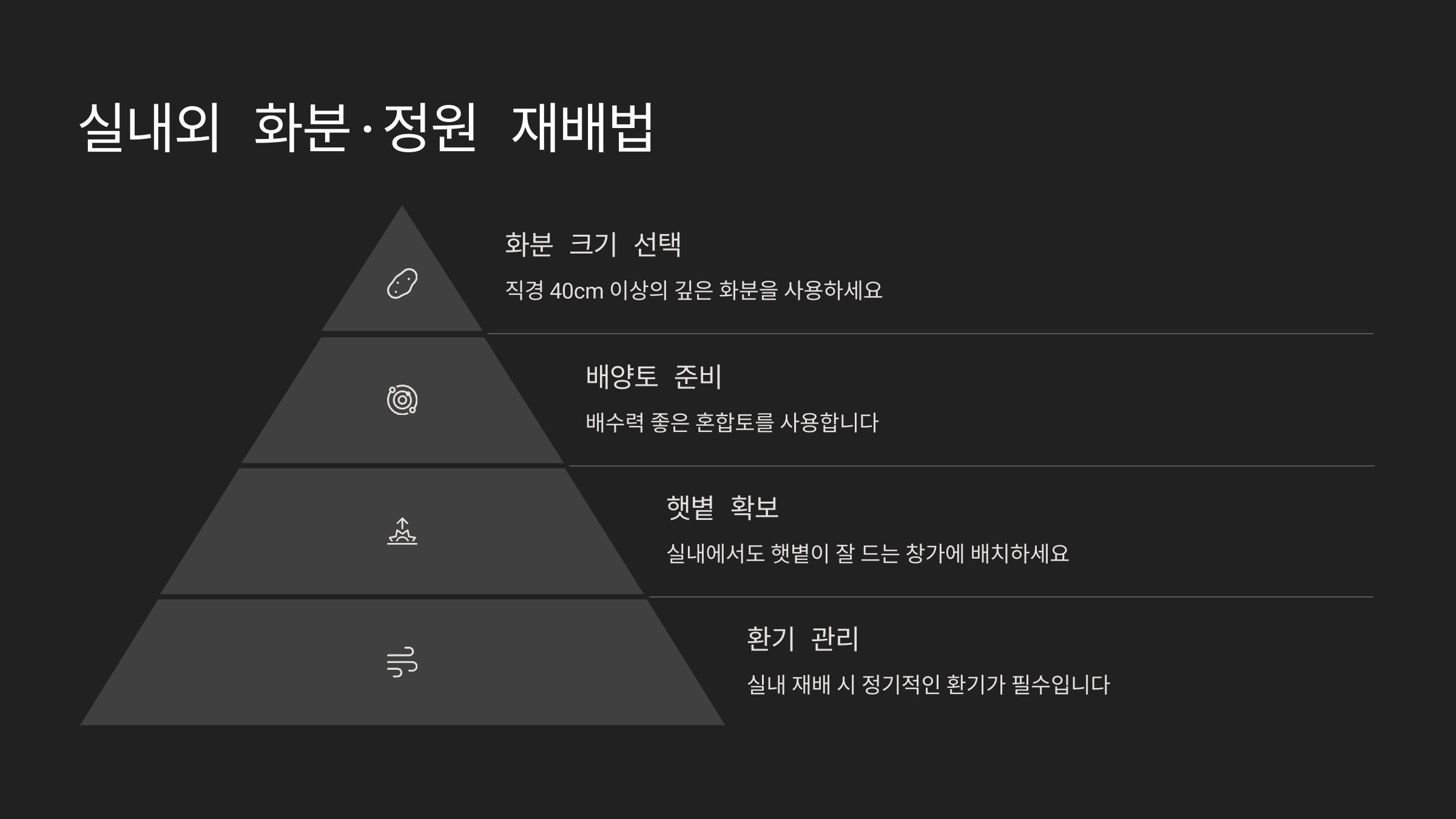 | 토양 준비 | 배수 좋은 흙, 거름 | 습기 과다 피하기 | 퇴비 사용 | 봄 |