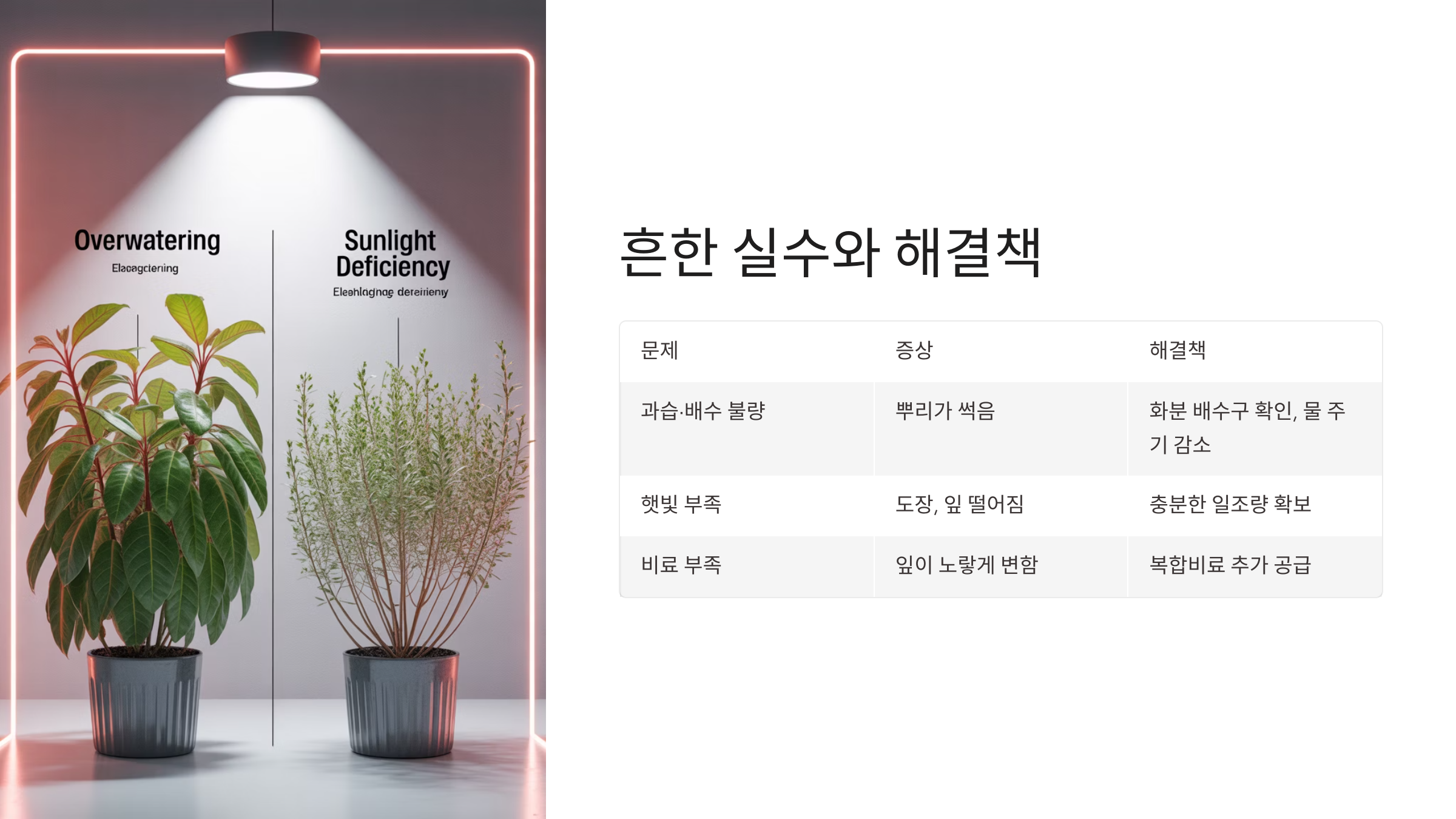 | 뿌리썩음병 | 뿌리 부근 물 고임 | 배수 개선, 병든 부분 제거 | 장마철 | 배수 관리 |