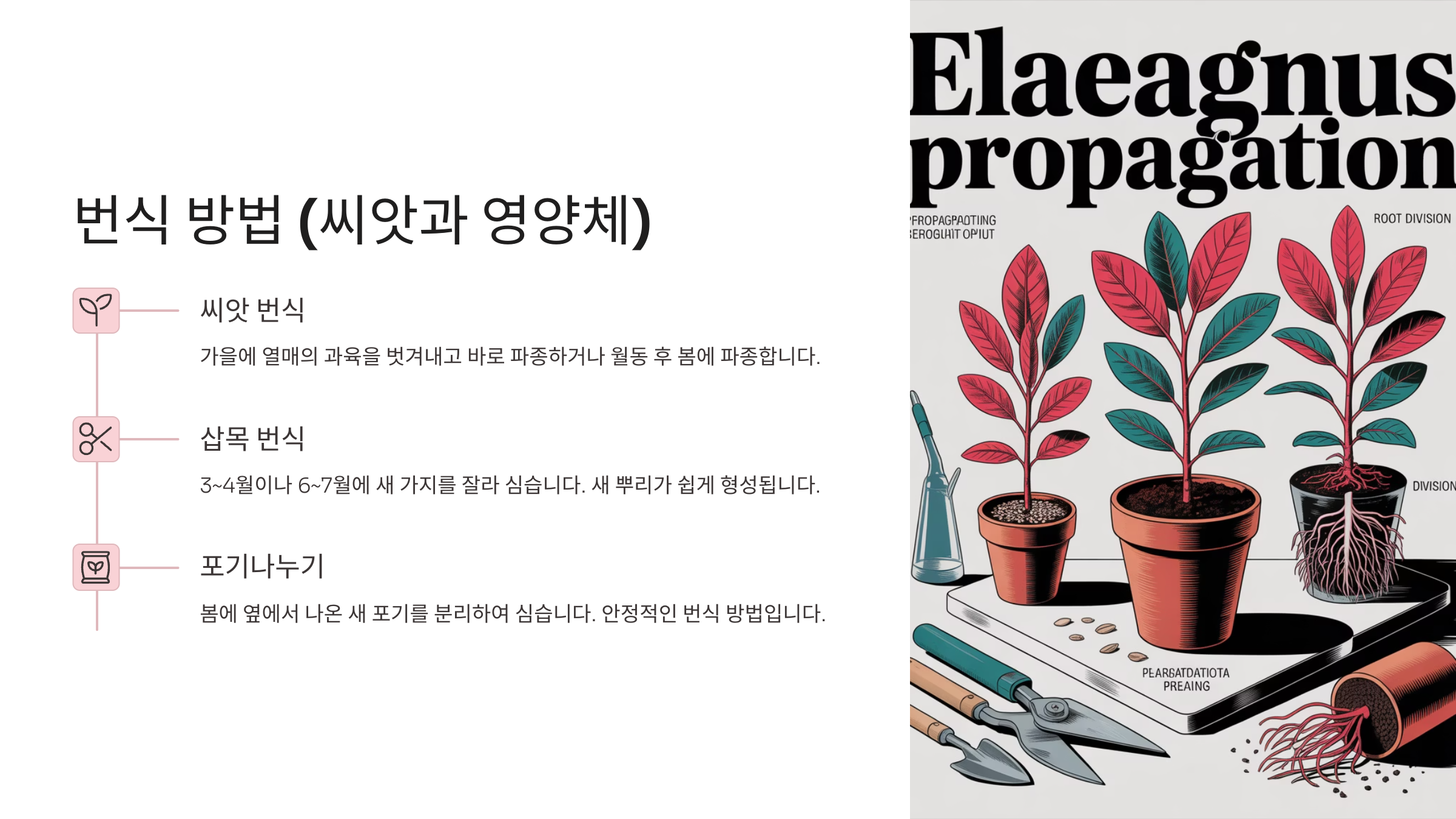 | 식재 | 50cm 깊이 식재 구덩이 | 흙 단단히 고정 | 물 흠뻑 주기 | 봄, 가을 |