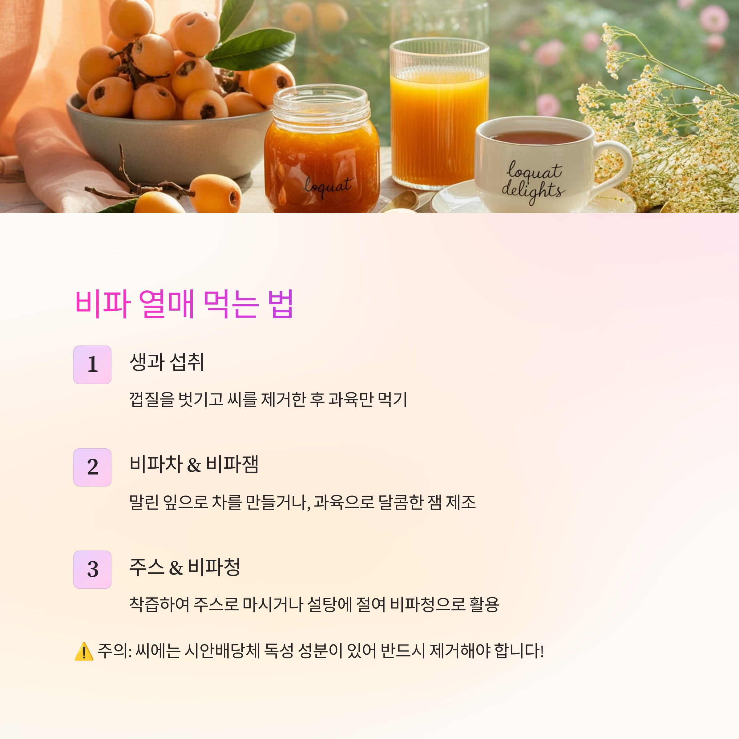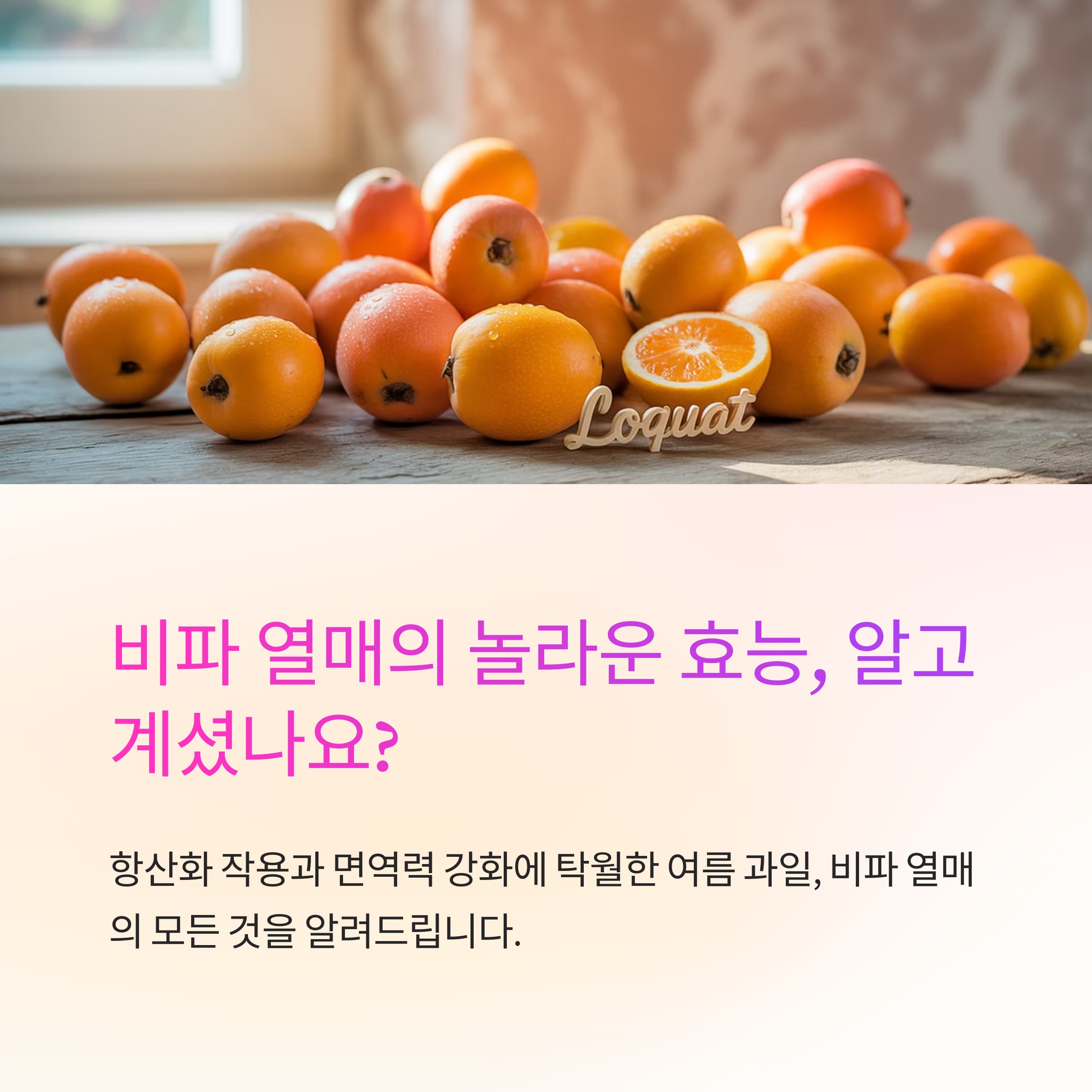 비파 열매는 과일 중에서도 뛰어난 항산화력과 장점이 많은 건강 식품이지만, 씨앗 섭취와 과다 복용 시 주의가 필요한 과일이기도 합니다. 올바르게 알고 먹는다면 비파는 여름철 건강과 면역력을 지켜주는 자연의 보약이 될 수 있습니다. 다양한 방법으로 즐겨보며, 계절의 건강함을 누려보세요.
