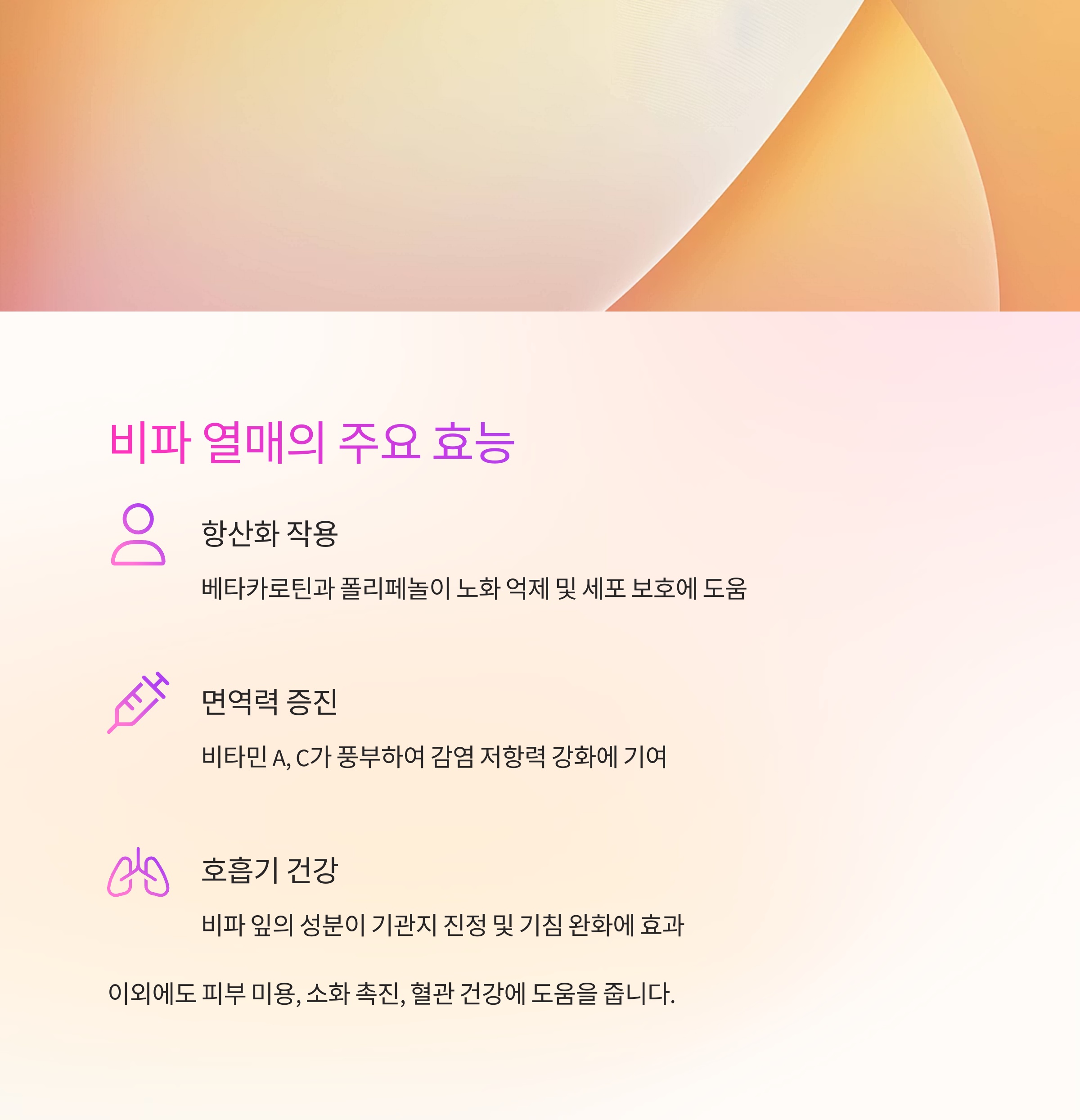 | 항산화 작용 | 베타카로틴과 폴리페놀이 노화 억제 및 세포 보호에 도움 |
