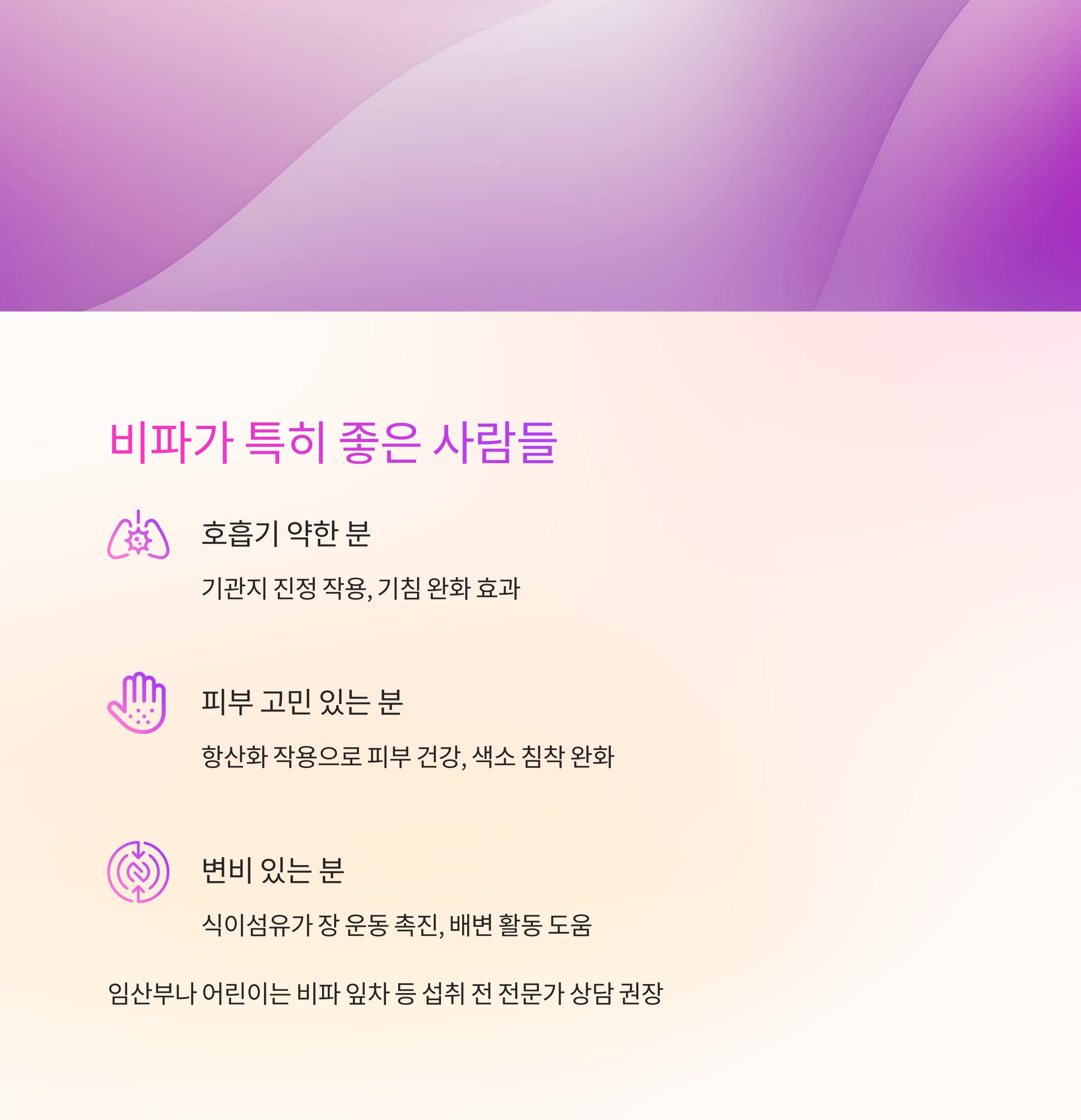 | 호흡기 약한 분 | 기관지 진정 작용, 기침 완화 효과 |