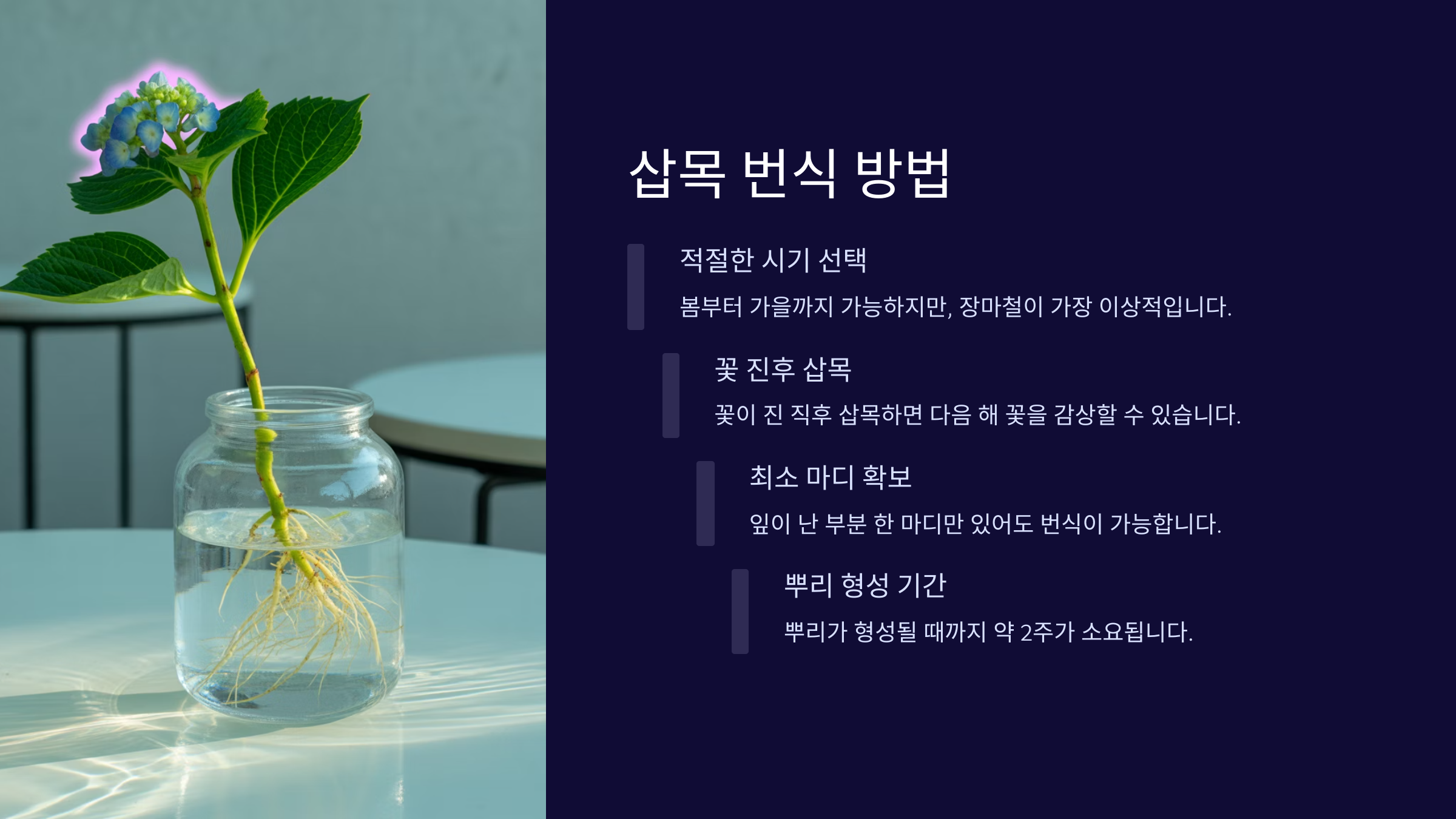 수국은 삽목(줄기 번식)이 아주 잘 되는 식물이에요! 직접 기른 수국에서 가지를 잘라 새로운 수국을 만들 수 있다는 점이 정말 매력적이죠. 제대로만 하면 1~2달 안에 뿌리를 내리고 꽃도 피울 수 있어요 😊