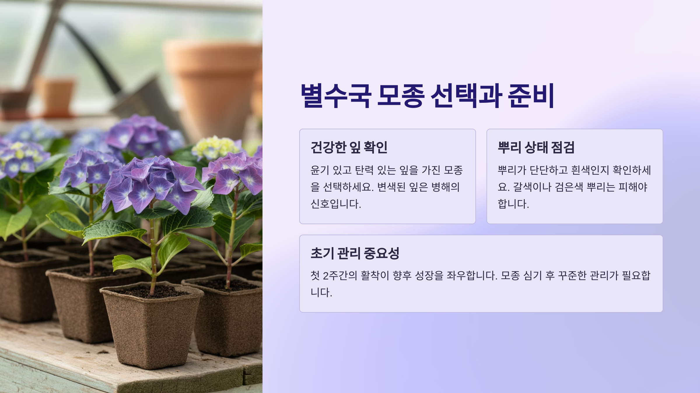 별수국을 처음 키우는 분들이 가장 헷갈려하는 게 바로 모종 심기예요. 잘못 심으면 뿌리가 썩거나 꽃이 피지 않기도 하니까, 처음 자리를 잘 잡아주는 게 무엇보다 중요해요! 모종 상태에서 제대로 관리하면 그해 여름부터 꽃을 볼 수 있답니다 😊