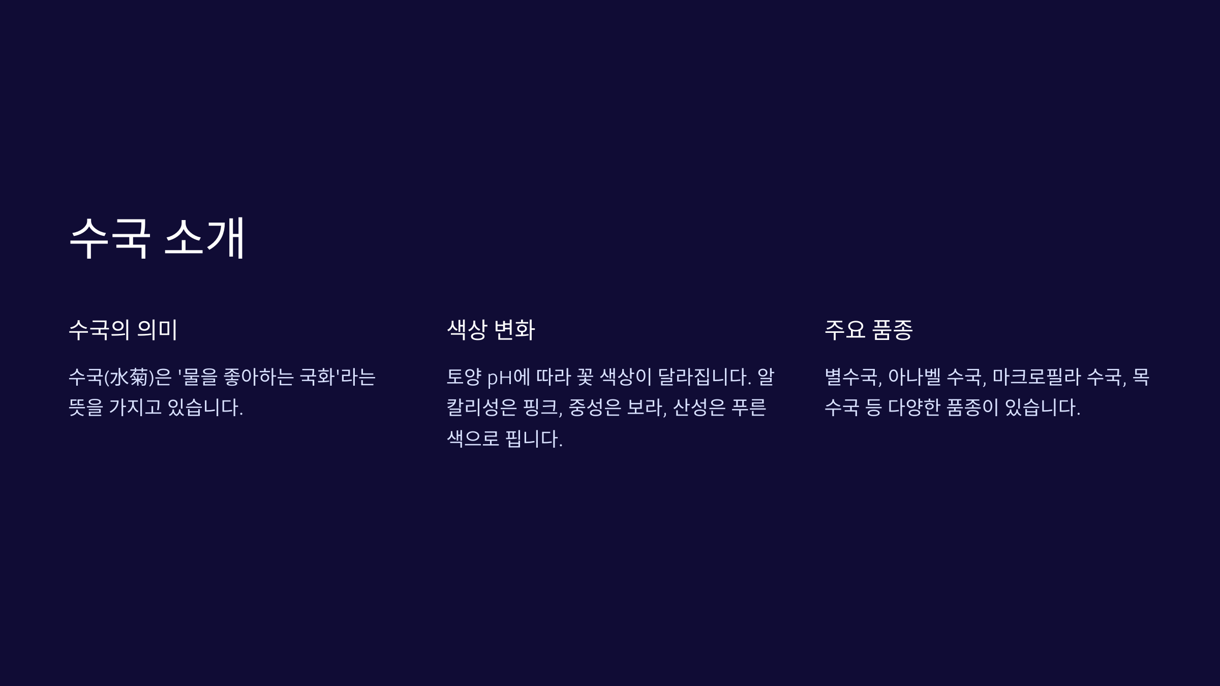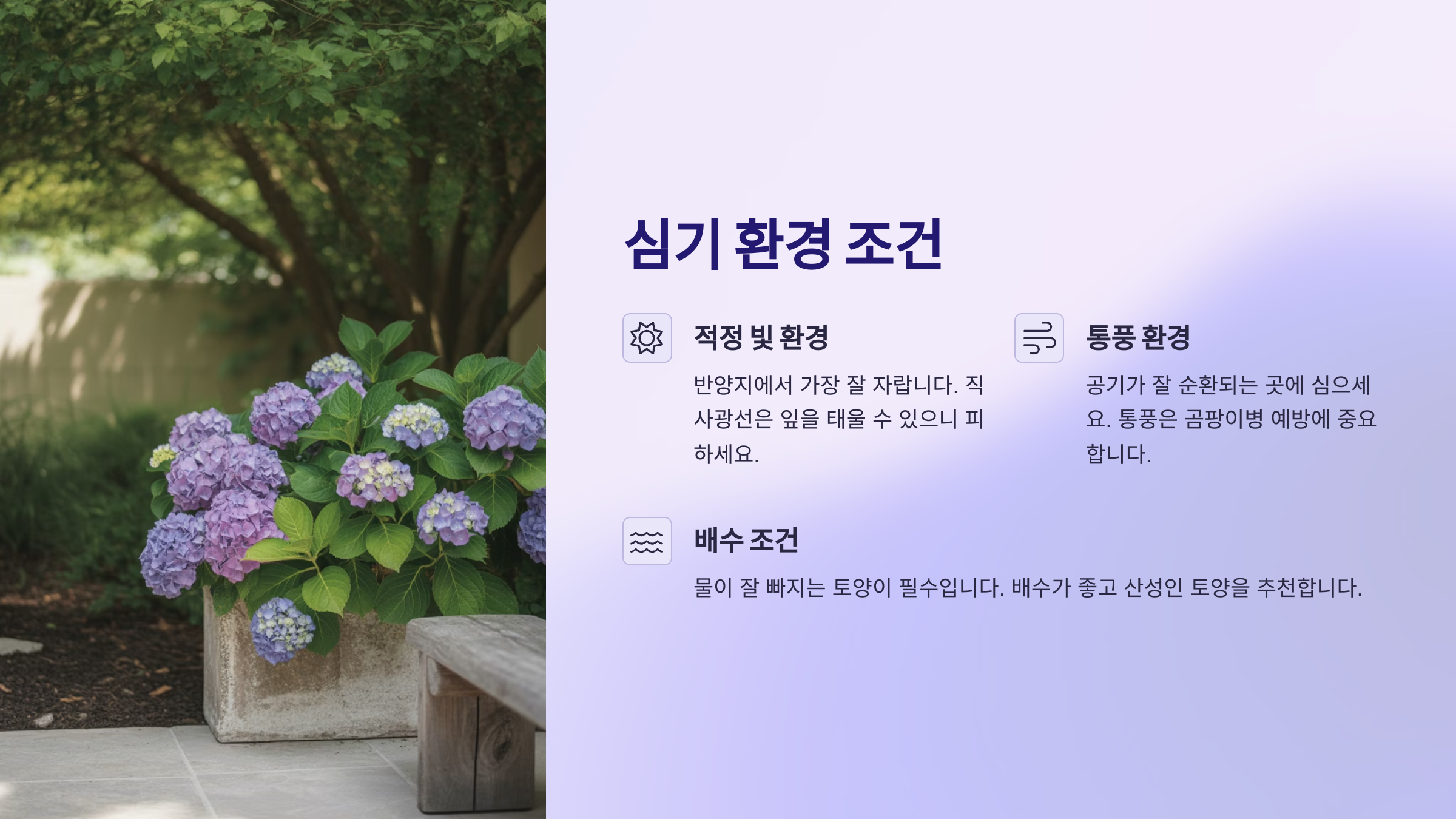| 산수국 | 가운데 꽃봉오리 중심 | 작고 섬세함 | 야생적인 느낌 |