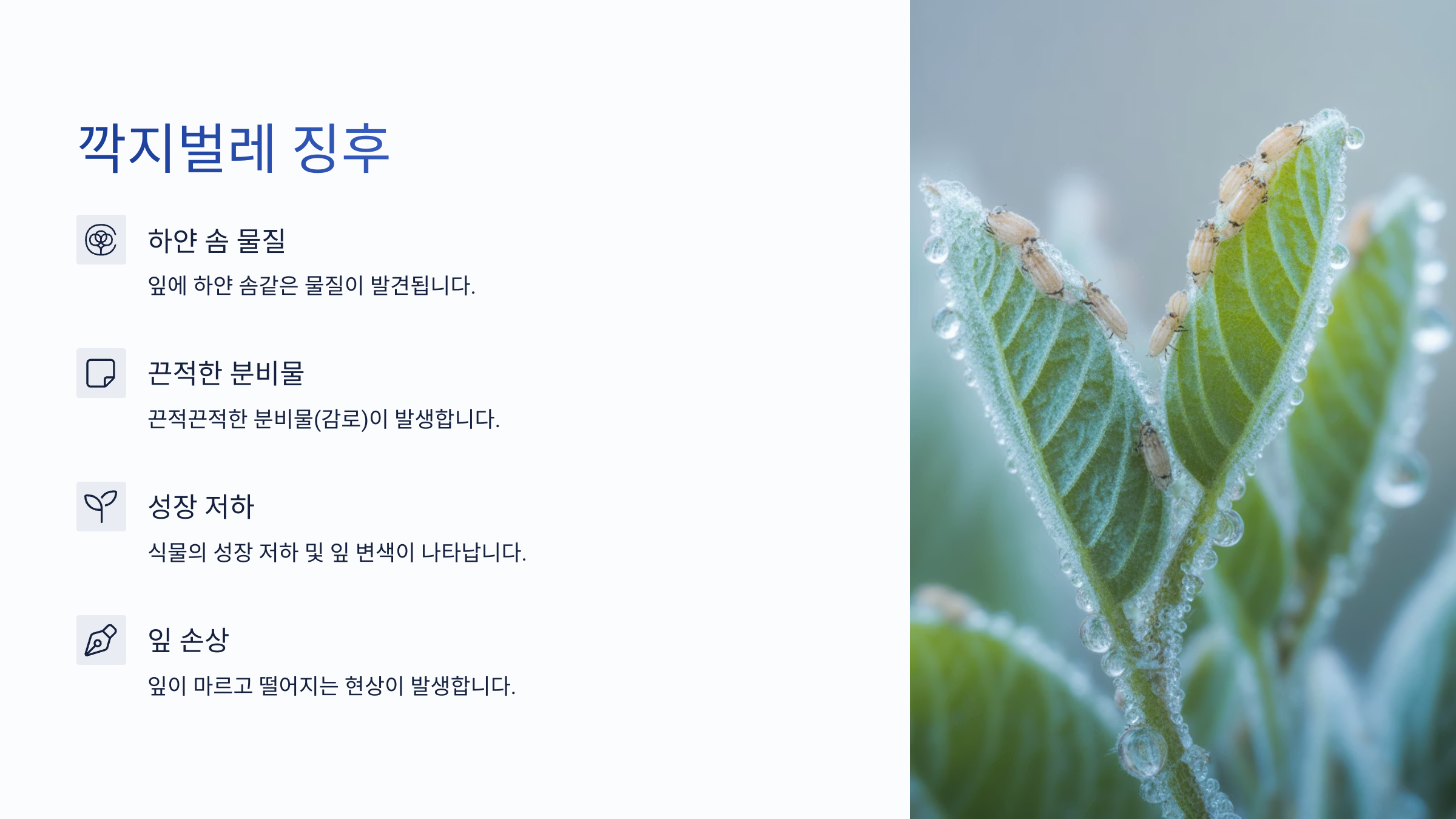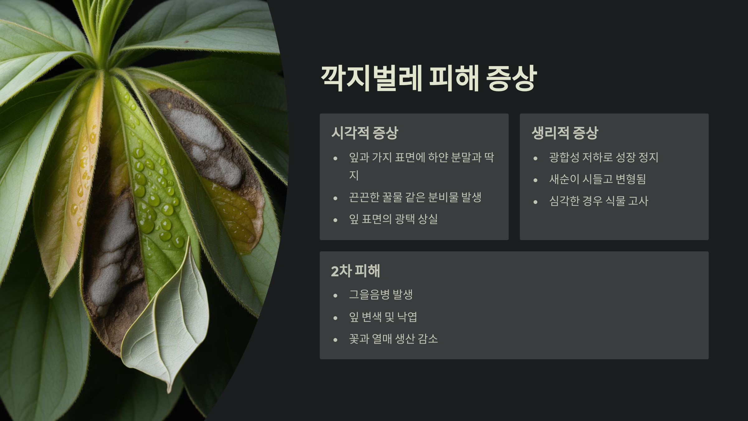 이 녀석들은 식물의 줄기, 잎, 심지어 뿌리까지 공격해서 식물을 점점 쇠약하게 만들어요. 즙액을 빨아먹히면 잎이 누렇게 변하거나 성장이 멈추고, 심하면 식물 전체가 말라죽기도 해요. 게다가 깍지벌레의 배설물은 끈적끈적한 '감로'를 만드는데, 이 감로 때문에 잎이 번들거리고 곰팡이가 피어 검게 변하는 '그을음병'을 유발하기도 한답니다. 으, 생각만 해도 끔찍하죠?