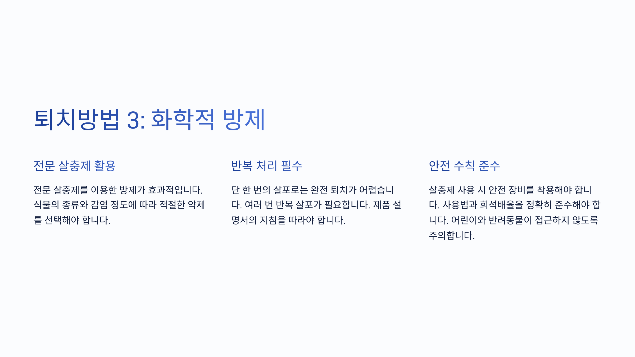 - 발견 즉시 대처: 초기에 물리적으로 제거하는 것이 가장 효과적!