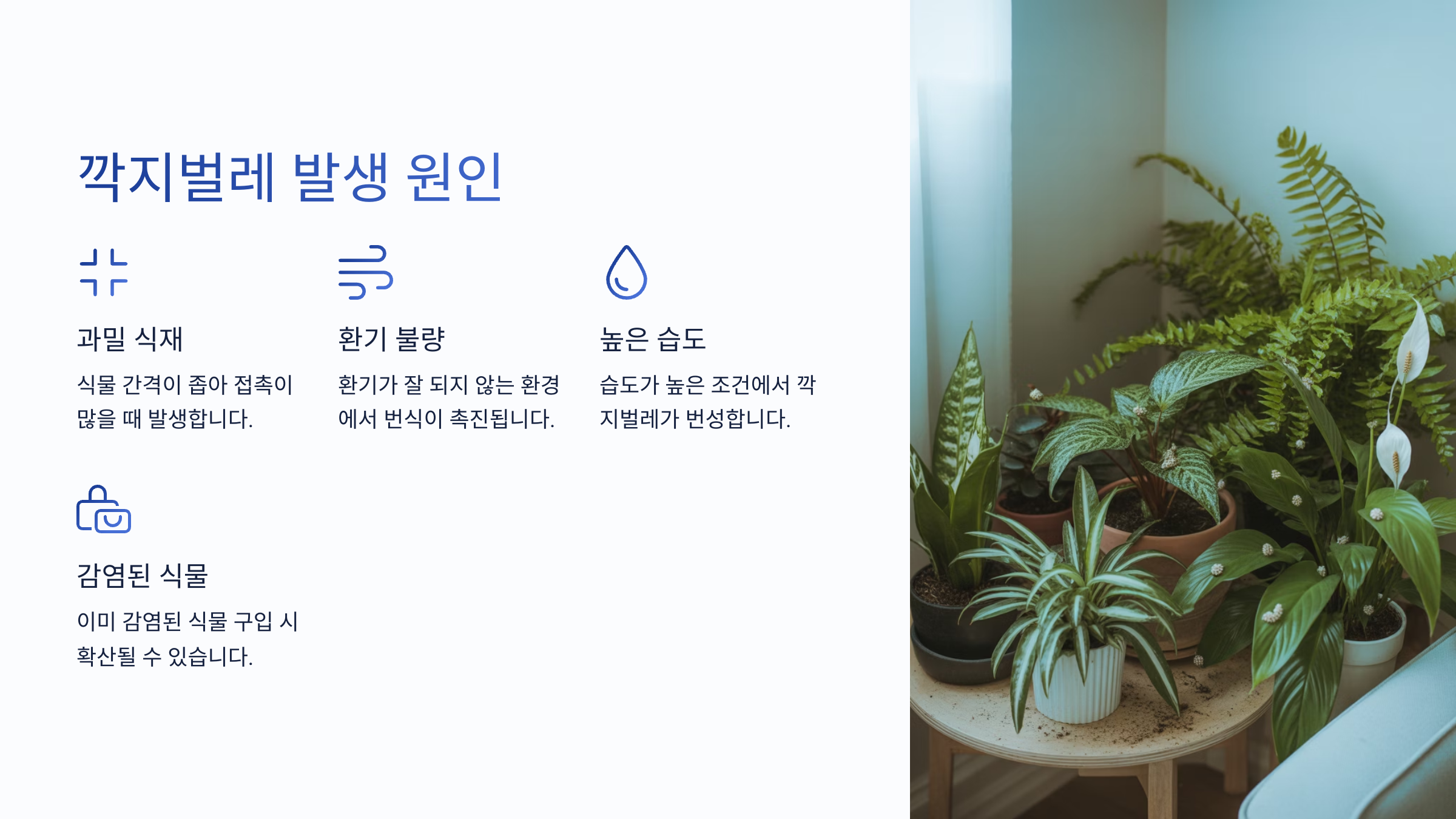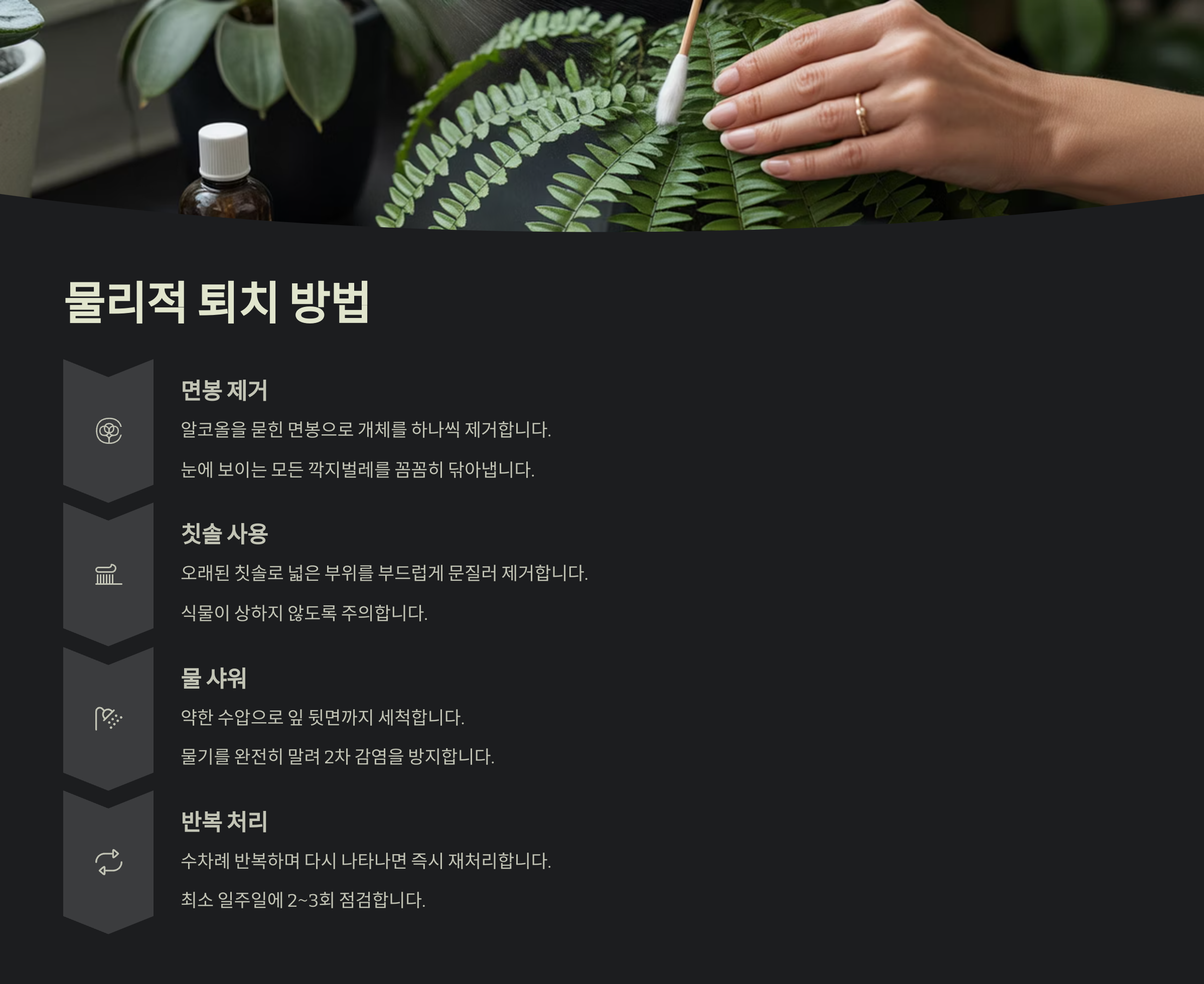 - 예방이 중요: 통풍, 적절한 습도, 주기적인 관찰, 새 식물 검역 생활화!