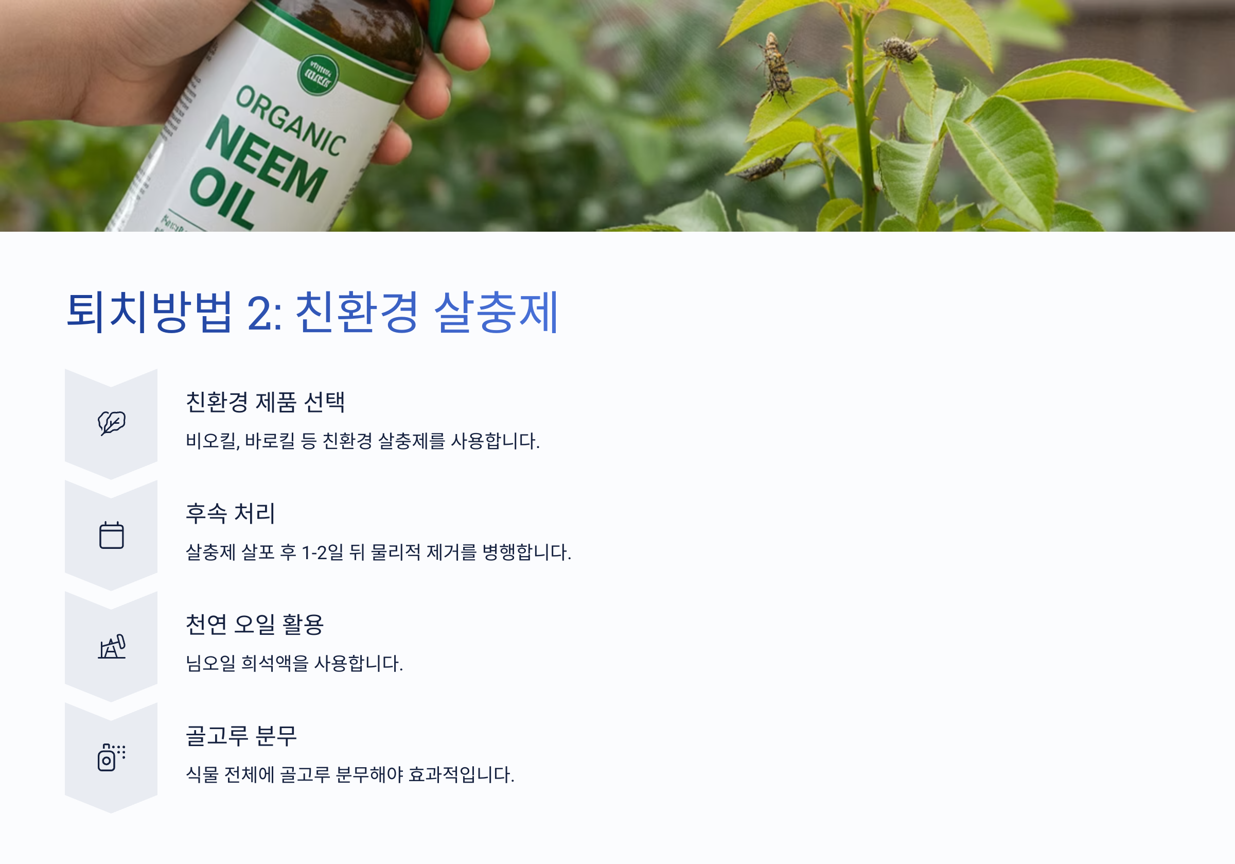 친환경 방제 시 주의사항: 반드시 해가 진 저녁이나 흐린 날 오전에 사용하고, 사용 전 식물의 작은 부분에 테스트하여 약해가 없는지 확인하세요. 3~5일 간격으로 2~3회 반복해야 효과를 높일 수 있습니다.