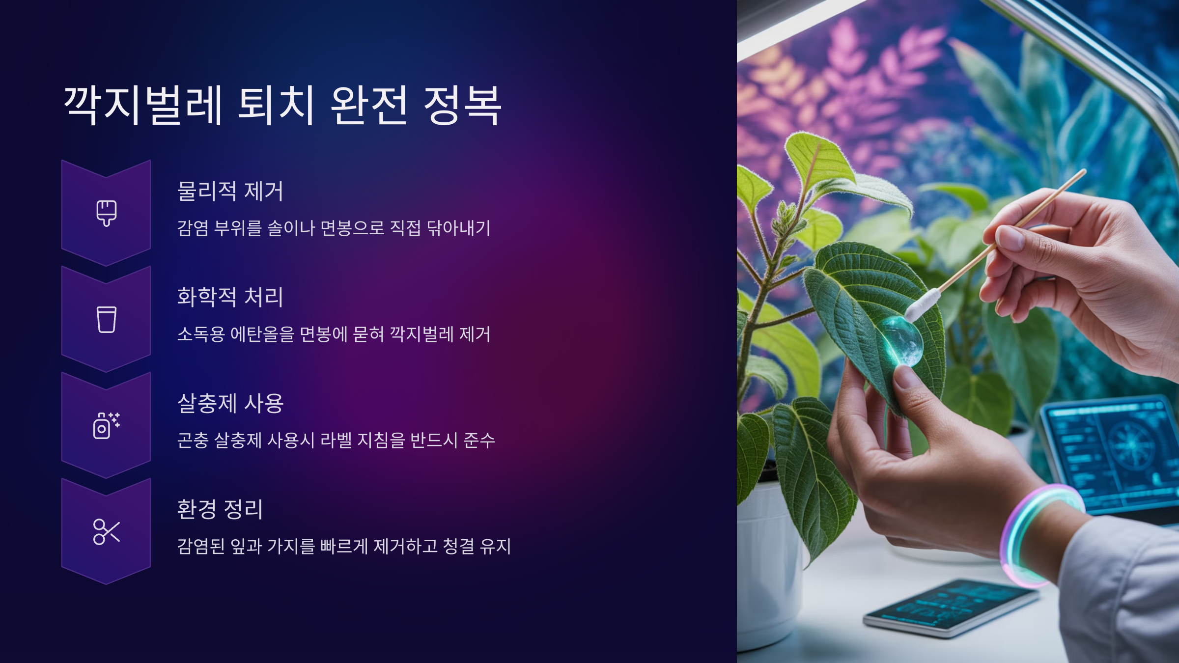 자, 이제 가장 중요한 깍지벌레 퇴치 방법을 알아볼 시간입니다! 깍지벌레는 번식력이 좋고 방제가 까다롭기 때문에 초기에 발견하고 빠르게 대처하는 것이 무엇보다 중요해요.
