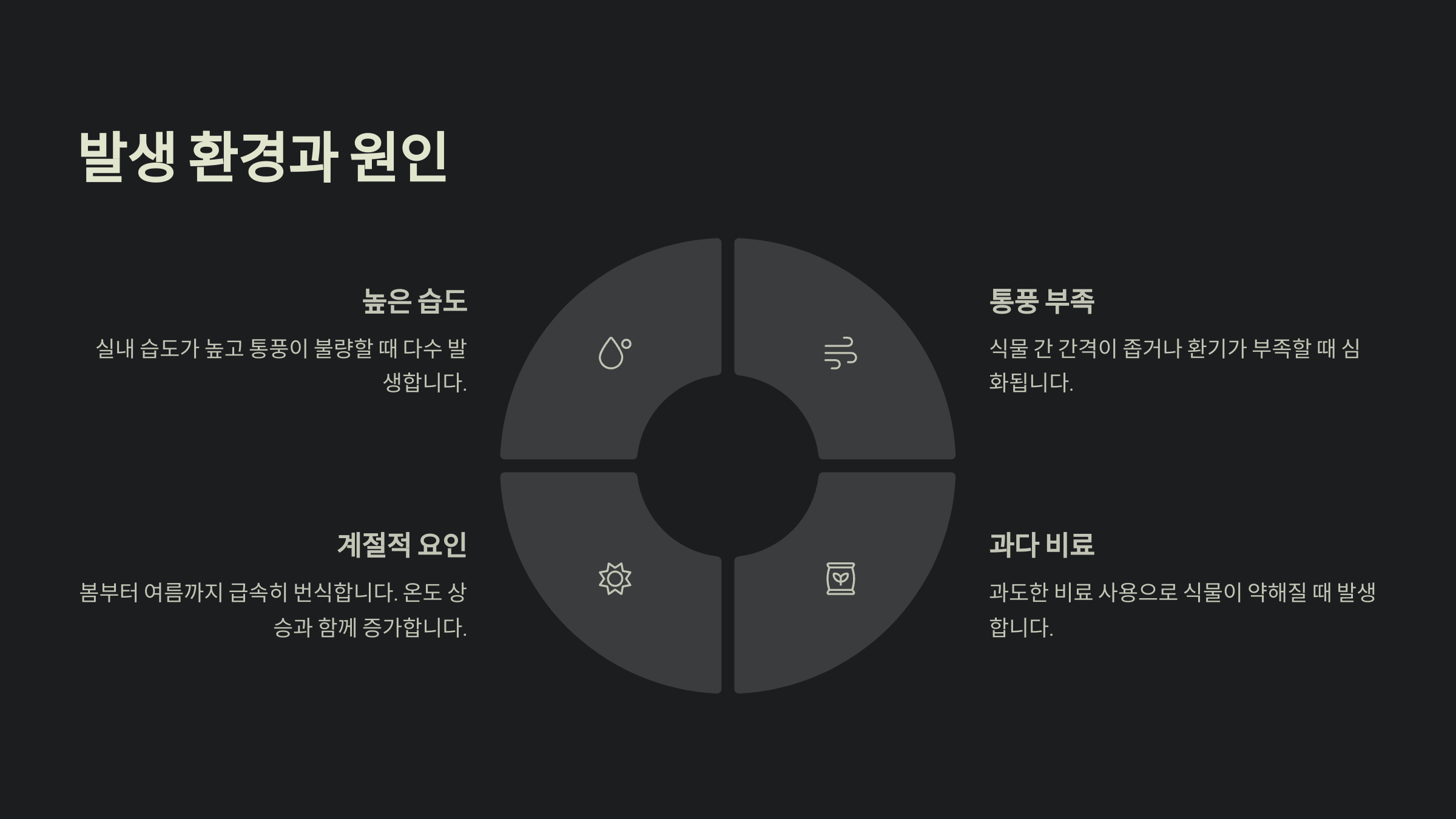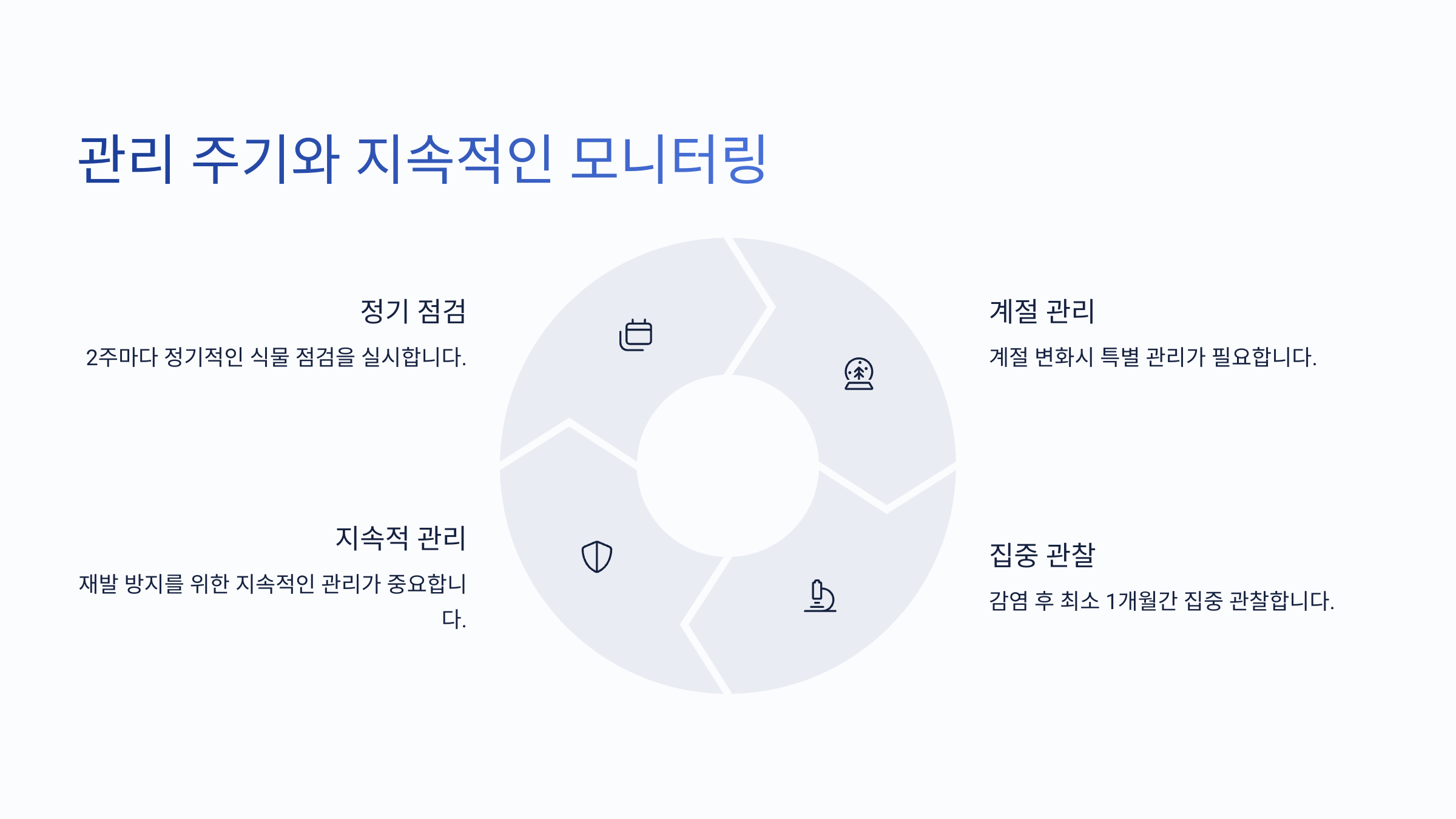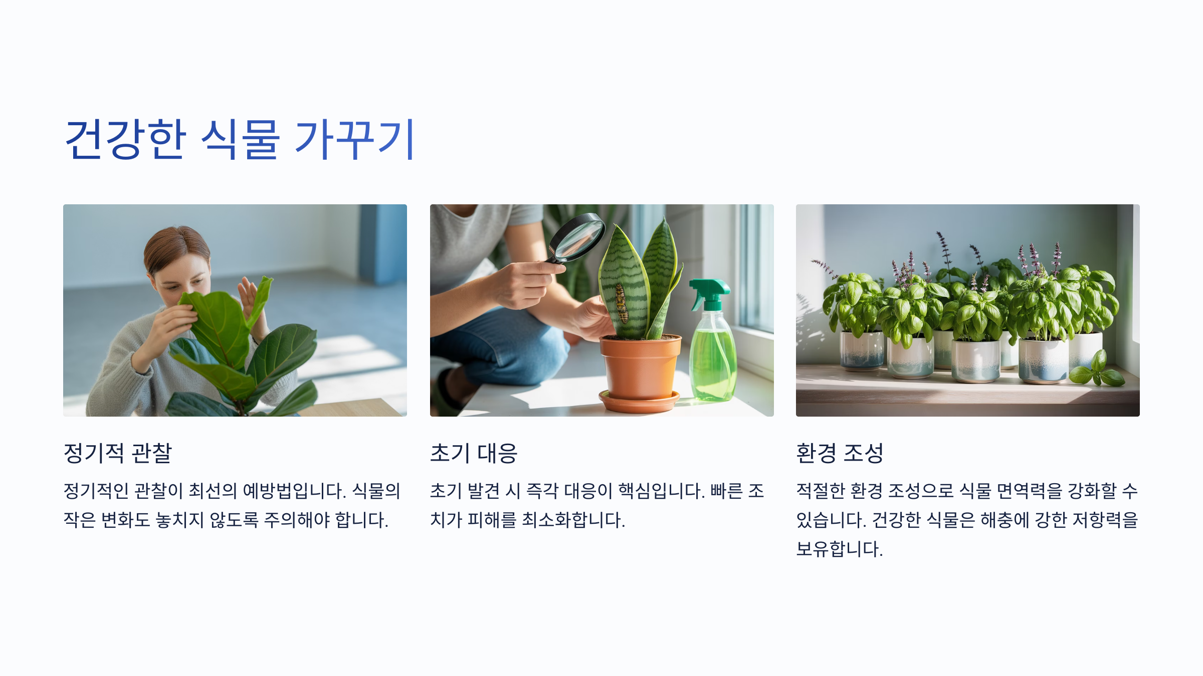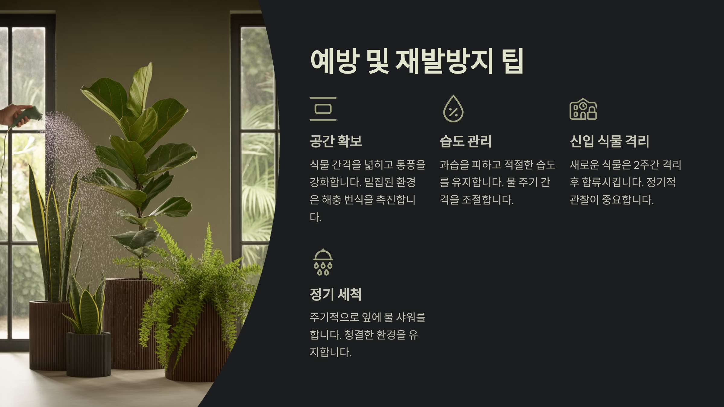 - 예방이 중요: 통풍, 적절한 습도, 주기적인 관찰, 새 식물 검역 생활화!